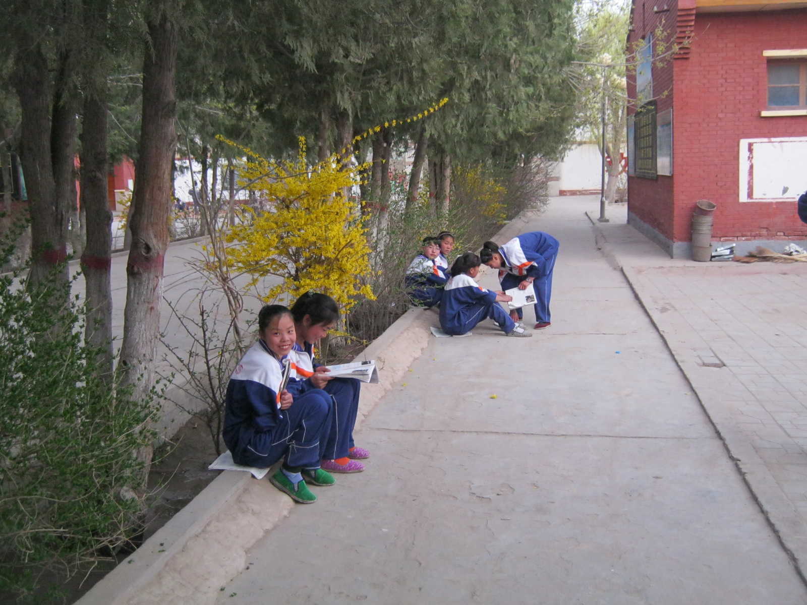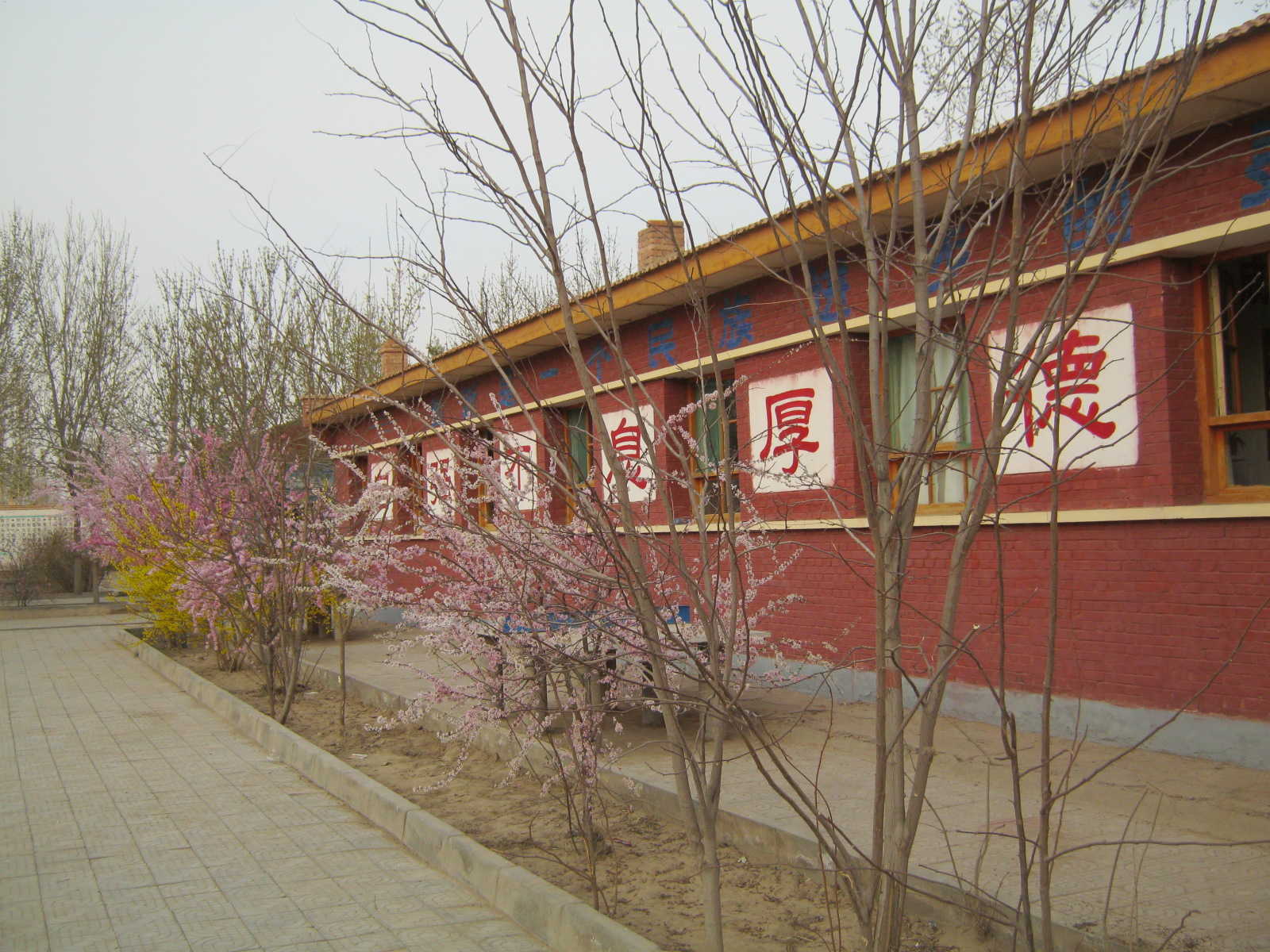 教室后面也发生了新变化。原来有点陈旧的墙壁被红色的涂料粉刷得焕然一新了,而且每一个窗户之间的墙壁上也进行了加工,榆叶梅和连翘也竞相开放,在红黄相间花儿的衬托下,"自强不息,厚德载物"八个大字,格外显得庄重大气。