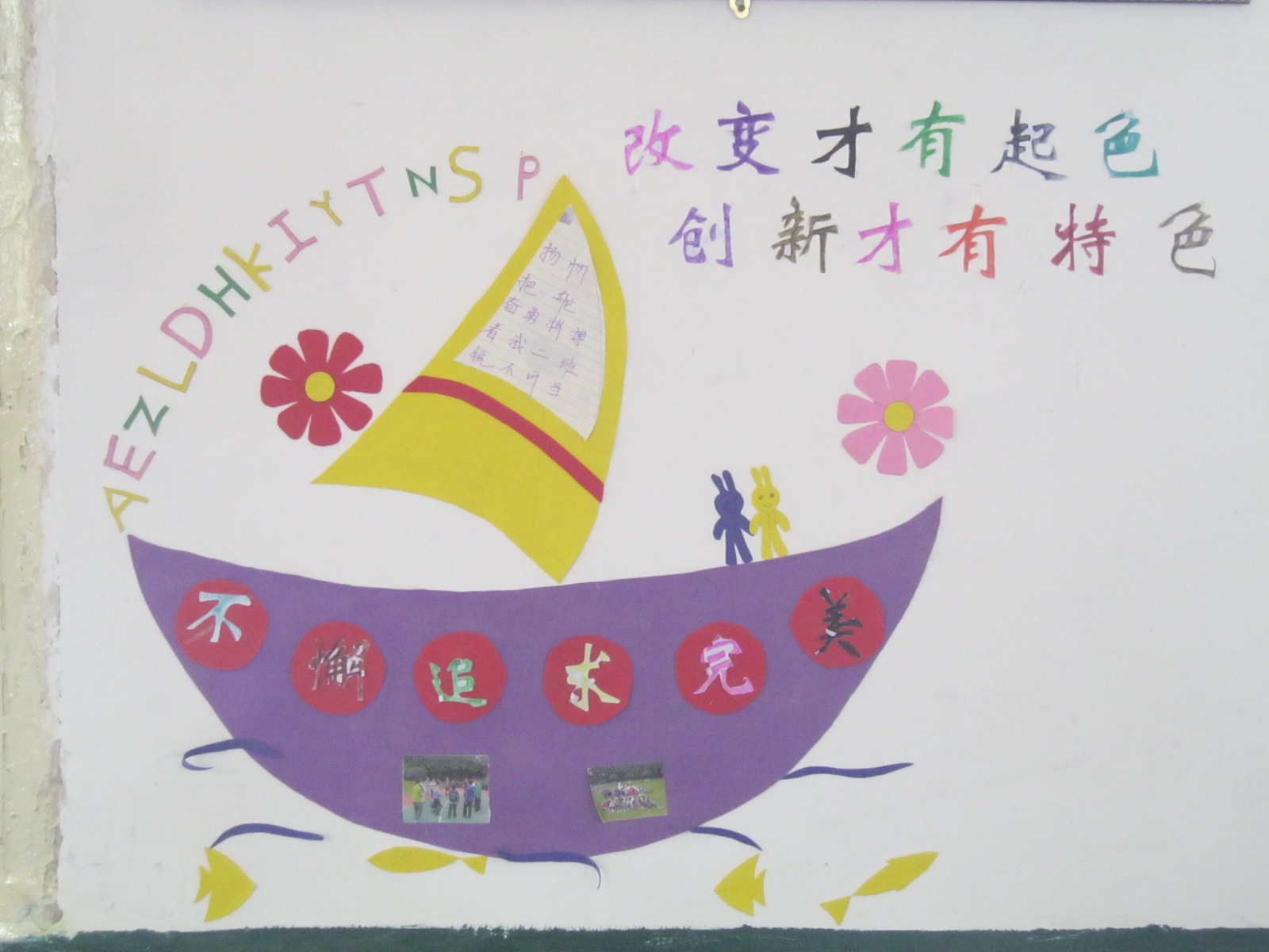 本学期,我们班换了一个新班主任,他对前任班主任布置的教室有些不满意,要求我们重新布置教室。他只给我们提供了他的一个思路,快乐,梦想。至于怎么布置,全靠我们自己了。 花儿对我笑,这是我们在阳光下快乐成长!