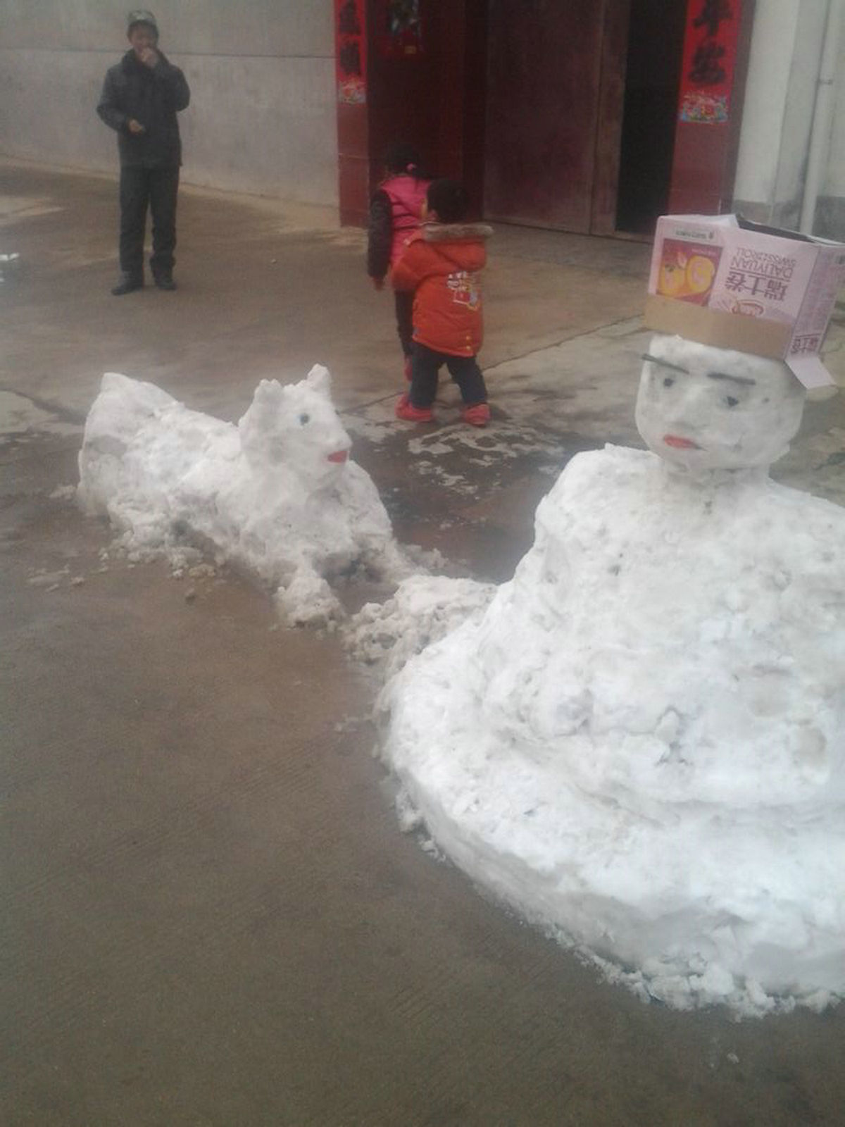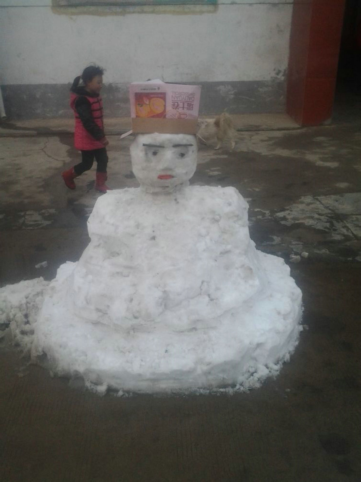 说起堆雪人,好像挺简单,但实际做起来并不那样简单。就说这采集雪吧,紧挨地面的雪不能要,露在最外层的雪也不能要,因为已经不洁白了。只能要中间最干净的那部分雪,这就挺费时间的。当然我们也知道雪人中间的部分用什么雪都可以,但我们自己做,就要做的最好,不能投机取巧。我们可不想最后雪人融化时变成了黑人。我们还堆了个稍微矮一点的雪人,用饼干盒子做他的帽子,旁边还堆了个卧着的小狗,看起来挺有意思。