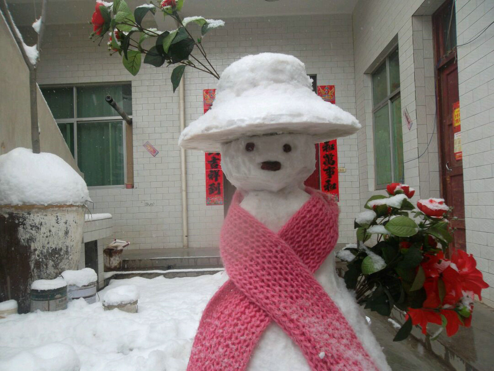 寒假的时候,好不容易下了一场大雪,我和小伙伴们当然不能放过这个大好的机会。我们准备一起堆雪人,准备堆一个大一点的雪人。我们先堆了个戴斗笠的雪人,还给她围上了粉红色的围巾。眼睛和嘴巴也已经出来了,但我认为这个雪人最成功的的地方就是她的斗笠了。