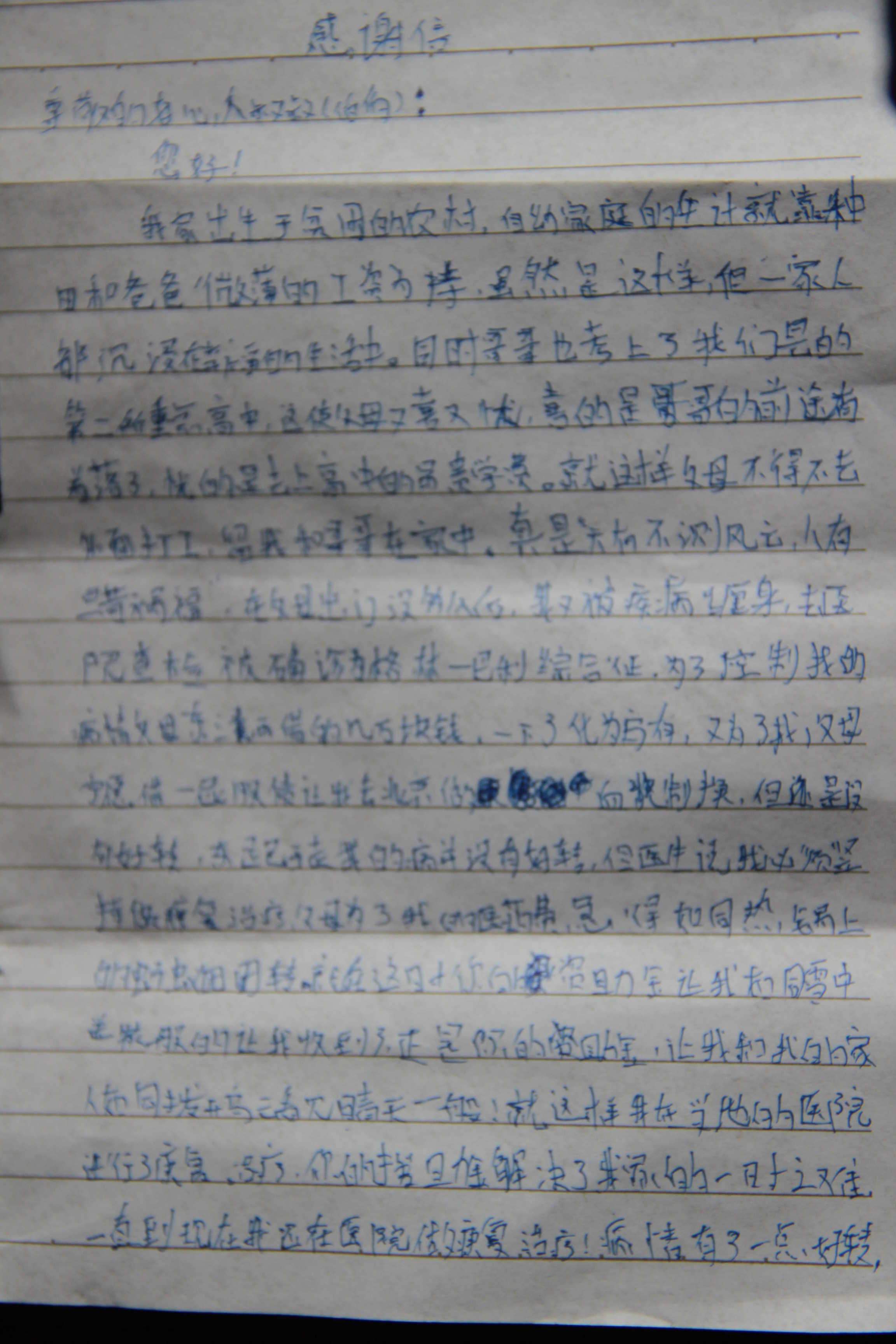 又为了我,父母宁愿借一屁股债让我去北京做血浆置换,但还是没有好转。东跑西走我的病没有好转,但医生说我必须坚持做康复治疗。父母为了我的医药费急的如热锅上的蚂蚁团团转。就在这时你们的资助金如雪中送炭般的让我收到了,正是你们的资助金,让我和我的家人如同拨开乌云看到晴天一般!就这样我在当地的医院进行了康复、治疗。你们的援助金解决了我家的一时之难,一直到现在我 还在医院做康复治疗,病情有了一点好转,但现在还不能走路。但你们的援助金鼓励了我,我们一家会坚持做康复治疗,我相信终有一天我会站起来。