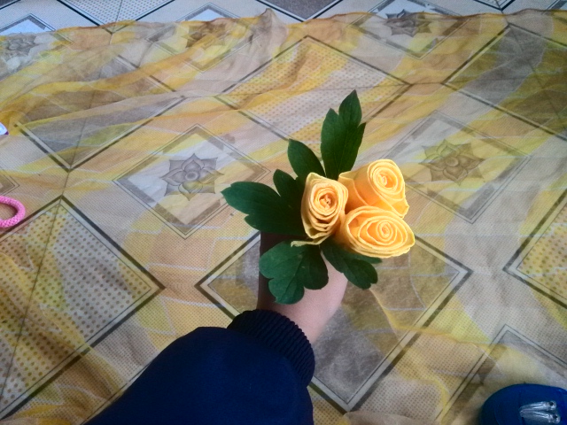 最后,是一件用不同的纸叠成的玫瑰花。做它的前提就是要准备好不同颜色的皱纹纸,还要有一些笔记本上的纸,还有胶水,剪刀。开始你要把皱纹纸剪成宽为7-8厘米的长条,再把笔记本上的纸卷成类似吸管一样就行了,然后把皱纹纸的一条长边往里翻卷起来,不要卷的太深。随后就能看到一朵朵漂亮的花了。好了,就说到这儿吧。我们期待有更好的作品在不久的将来能呈现在我们面前,带给我们更多的惊喜和喜悦吧!