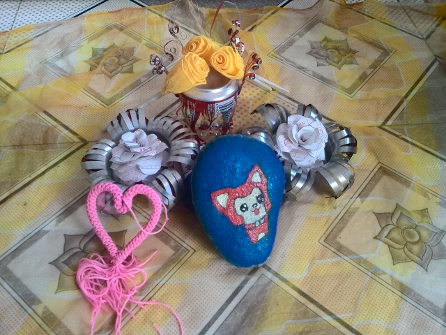 其次,是件把易拉罐变废为宝的作品,做这个就相对简单了。先找几个易拉罐,随便哪种都行,到最好是稍微软点的。再把里面残留的杂物洗干净,然后用剪刀把有开口的那一面剪去,只留下底面和侧面,把侧面剪成一条一条的,然后凭借你的想象力,可以把它们做成各种各样的作品。完成后的作品可以把它们摆在你卧室的书桌上,也可以放在其他适当的地方当作装饰品。总之它们比以前的废弃易拉罐有价值多了。