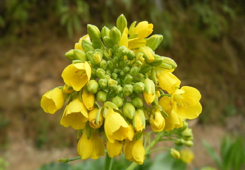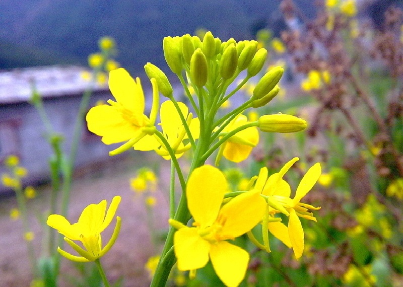 那金灿灿的油菜花一整片看起来十分光彩夺目,可是大家可能没有仔细观察过。一小株的油菜花上,有大约二十多朵小花,还有十几到二十几个花骨朵儿或花苞等着开放。如果你更加用心地去观察,还会发现,一株油菜花上的一朵小花,由四个萼片,四片花瓣,六个雄蕊和一个雌蕊组成。真没想到一株小小的油菜花内容还这么丰富,竟有几十朵小花,看着这些小花紧紧团抱在一起,组成了美丽的金色花球,我禁不住赞叹这大自然鬼斧神工的杰作!