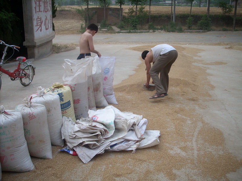从农民口中得知,我们这里今年收成很好,这位农民只有四亩地,晒干后,装了将近50袋,每亩产量可达一千斤。他说,这些粮食,可供他们家吃三年的啦。
