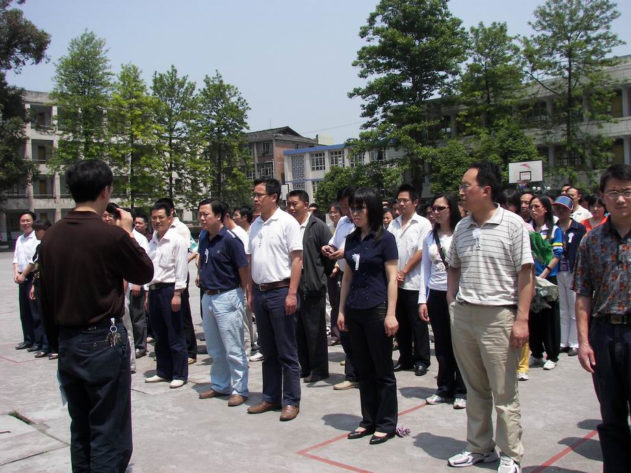 在5月19日那天,校园里老师们集中在操场上,由教育局的领导组织这次哀悼仪式。 天全县初级中学、第一完全小学和教育局的所有教职员工都在这儿。大家的脸色都很凝重,老师们都在谈论着这次亲身经历的地震。除了汶川、还有几个受灾十分严重的地方,如北川,什邡、青川……这些地方真的可以说是夷为平地。有的学校跨塌,很多同学被埋在废墟下面;有的老师为了保护学生而不幸遇难;也有同学为了救自己的同伴接二连三跑上教学楼;有被埋在废墟下面的同学们一起团结,大家互相鼓励,等待被救出的那一刻…… 很多很多,数不胜数的感人事迹,老师们交谈着,很多老师都情不自禁地掉下了眼泪。