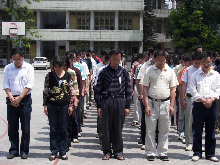 14时28分,老师们都默默地埋下头,这3分钟,对于每一个人来说都是那样的痛心。此时此刻,地震时的一幕幕、救援的一幕幕、感人的一幕幕都浮现在每个人的脑海里。时间在这一刻定格,遇难的每一位同胞都为人们所怀念。炎炎烈日下,老师们静静地站在操场上,每一位老师的面容都那么慈祥,没有了过去的严厉,让人看了都想去亲近。