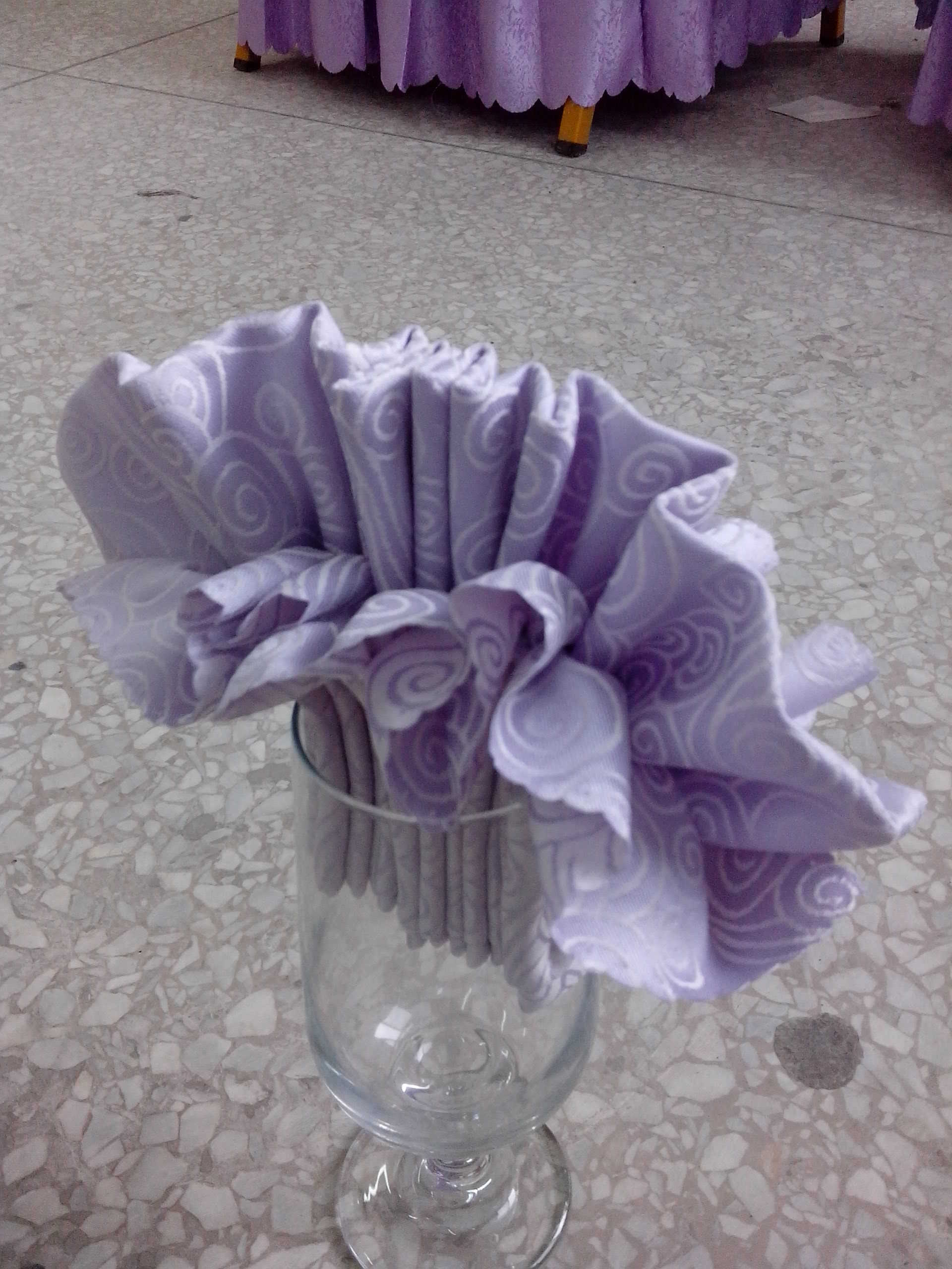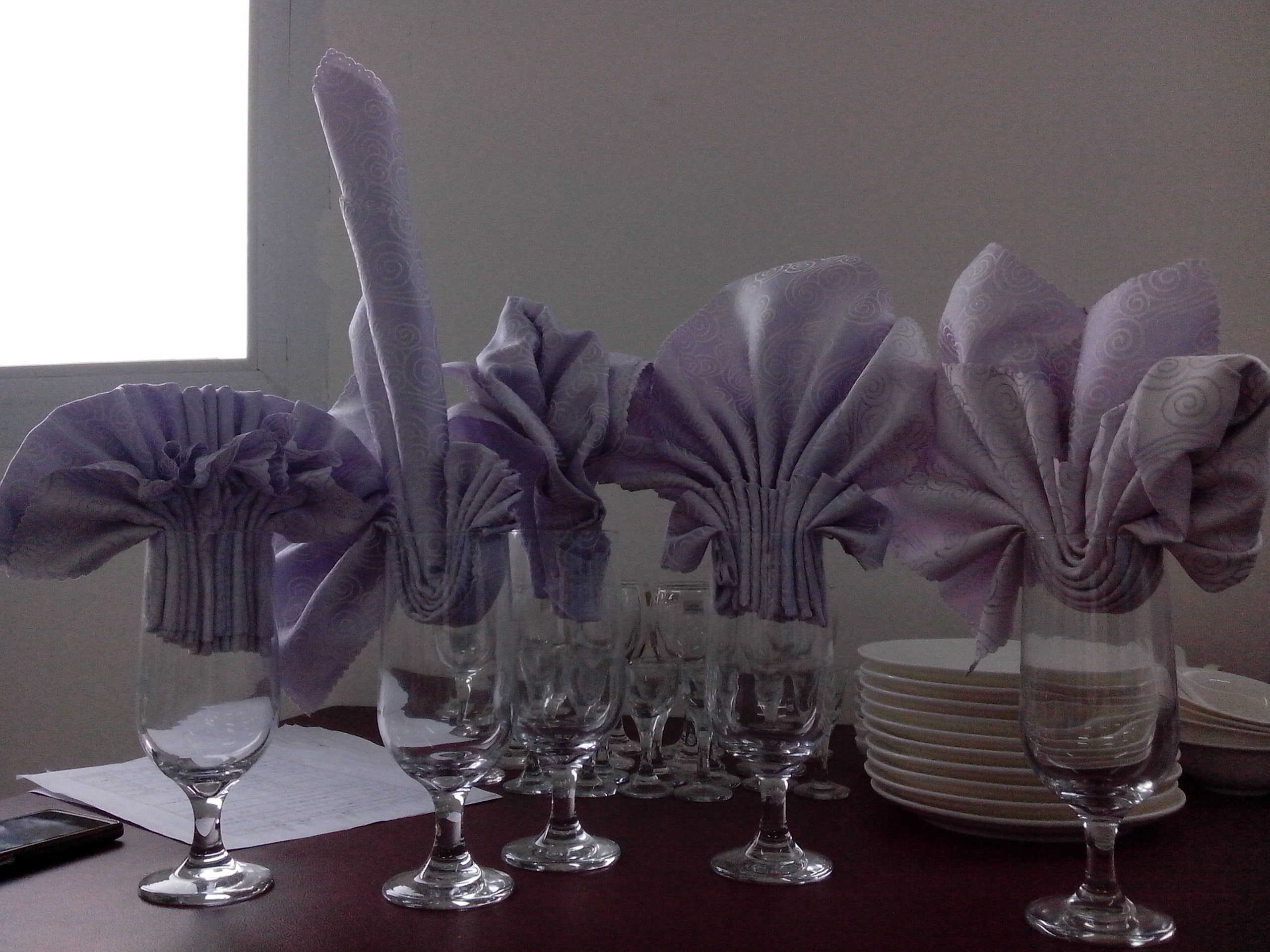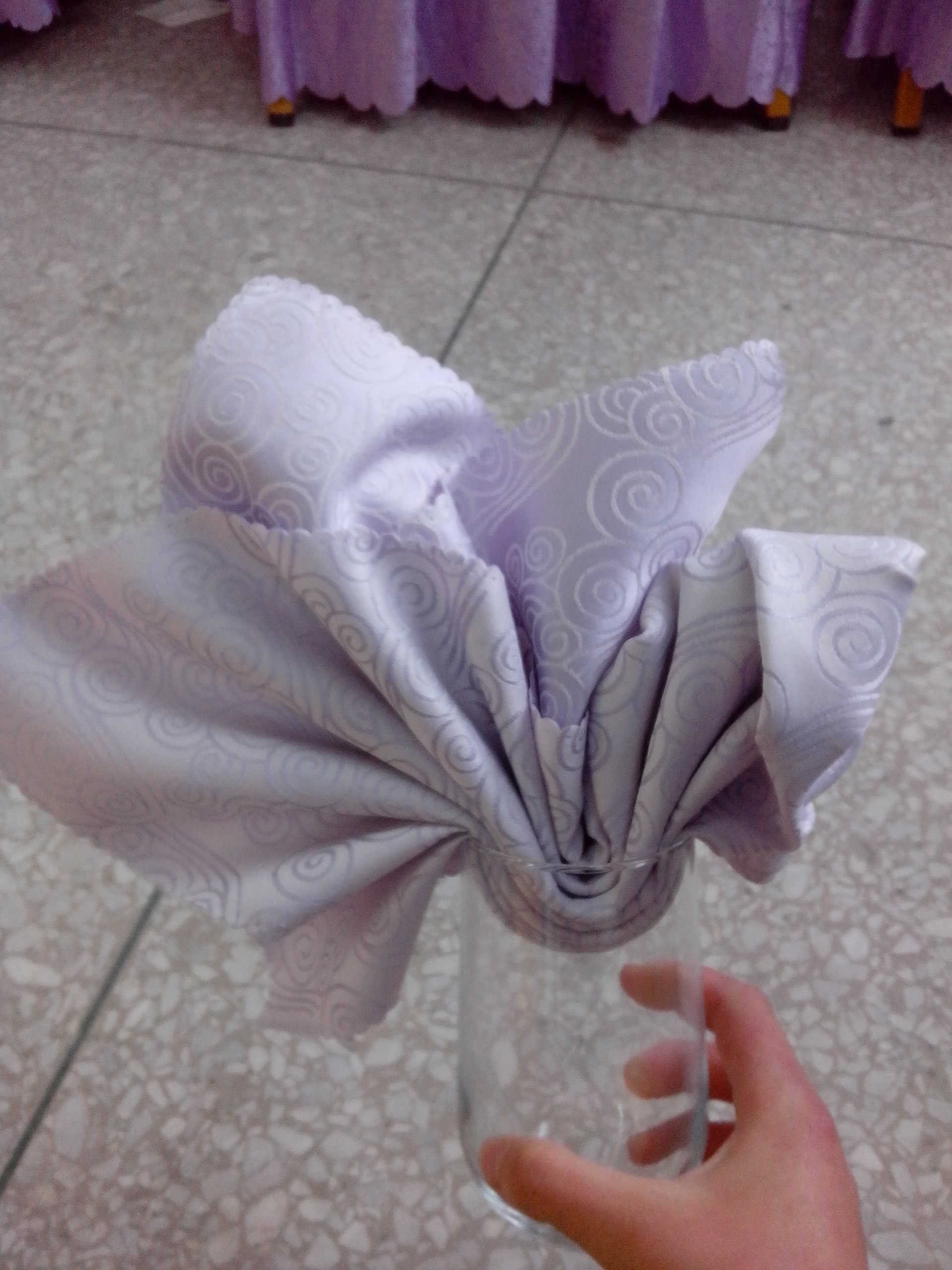 第二天,我们正在下面值班的时候,老师便让我们三个到旅游实作室去上课。到的时候,实作室李还有另外的三个学姐,听说就是她们教我们。我们学到了叠餐巾花的时候。我们三个兴致都挺高的,看着一张张餐巾在学姐的手里变成了一朵朵美丽的餐巾花,可羡慕了。