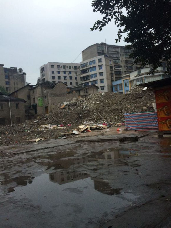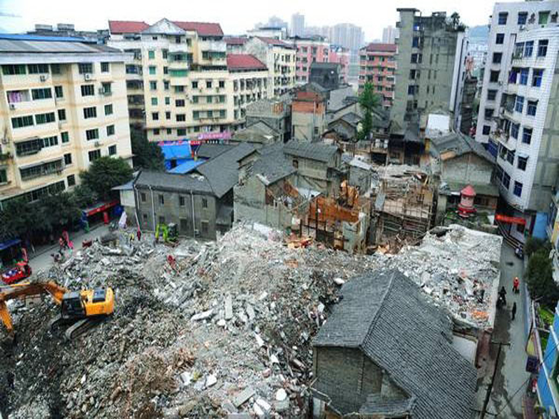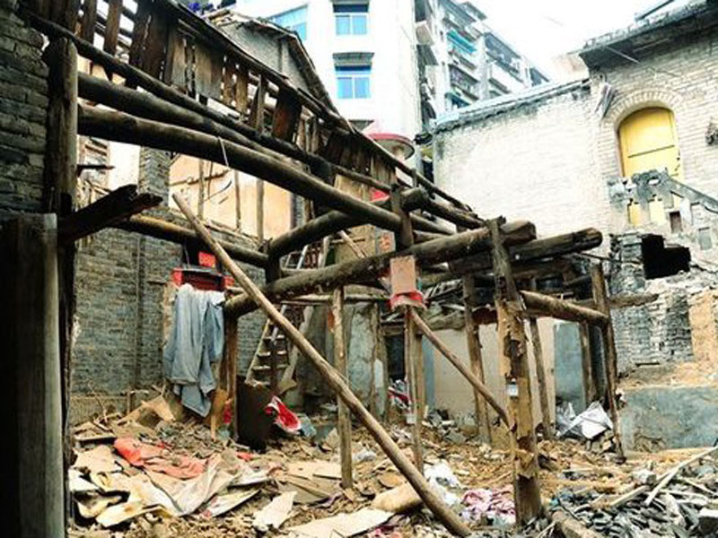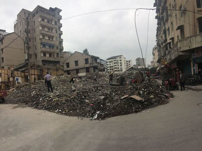 4月11日的早上9点钟,晓古街上站满了人,没过多久,随着一辆拉着挖掘机的车的到来,晓古街就慢慢的消失了,伴随着挖掘机的轰鸣声,晓古街的一面墙倒在了地上,变得粉碎,就这样经过了一个上午的时间,晓古街的一小半房子变成了水泥废渣。 在我们看的正入神的时候,一个声音打断了,随着声音看去,只见5辆大型的泥土运输车,慢慢的开了过来。