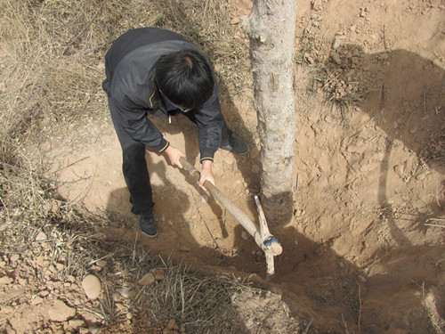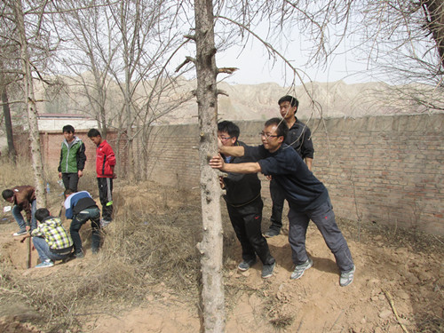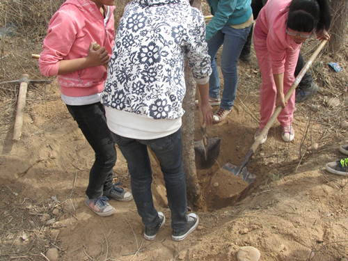 因为最近没有下雨,所以树周围的土都非常的干,我们要费好大的劲儿才能把土挖出来,后来一个同学想出了一个好办法,那就是边挖边摇动这些树。
