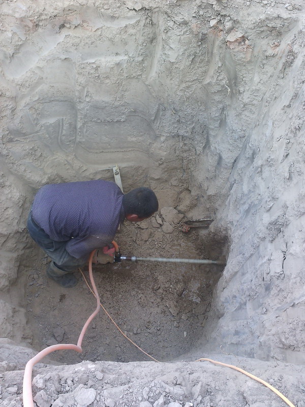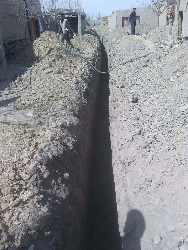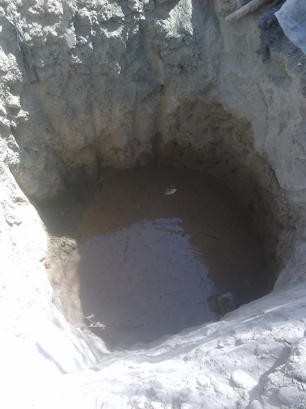 他们是怎么工作的呢?让我们来参观一下吧!首先,每户人家除了在行道里挖长道,还要在家里挖一个坑,爸爸点着了鞭炮,寓意开门大吉,然后,工人们沿着梯子下到我们家挖好的坑里,用一个大家什放在选定的位置用上电"吱嗞、、、、、、、"地转,不一会儿,水就从外面的坑里"咕咕"往外流,