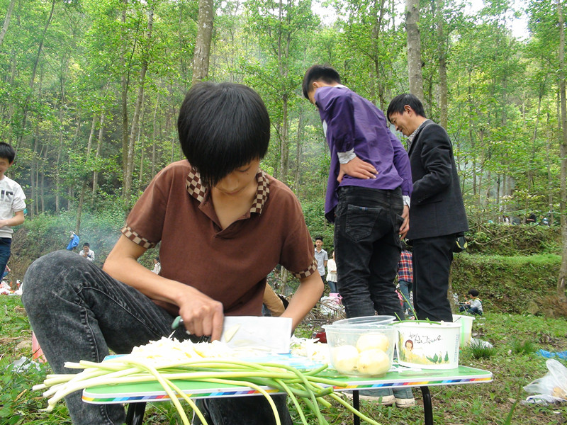 现在是掌勺"大师"陈宇隆大显身手的时候了,他给我们一共献上了五道菜肴:第一道蒜苔肉丝算是特色菜,色香味都还不错,看得我口水直流三千尺;第二道青椒肉丝,由于火候没掌握好,肉丝不脆嫩;第三道素炒土豆丝;第四道跑炒藕片;第五道番茄蛋汤,这道菜最寒碜,鸡蛋刚下锅,火灭了,待重新生火做已花去好几分钟,最后做出来的汤,真是不敢恭维。开饭了,大家吃做自己亲手做出的饭菜,虽然不是很可口,但个个都吃得津津有味。饭后大家便是自由活动,直到下午四点多,便又开始做晚饭,晚上我们和另一个组并在一起烫火锅。大约六点了,才依依不舍地离开圆山子。这次春游虽然有点累,但大家人人都玩得很开心。