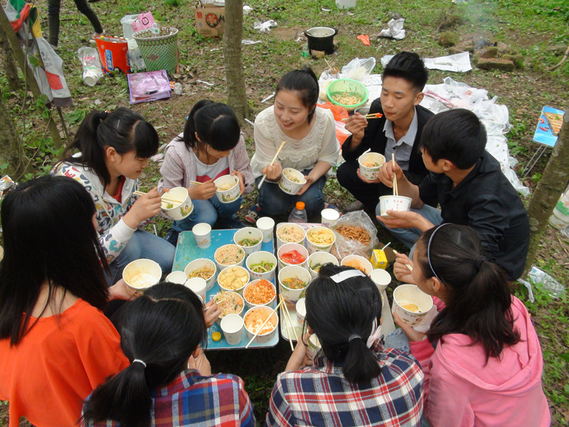 由于缺乏生活经验,第一道菜素炒土豆丝,炒得是半生不熟的。第二道西红柿炒蛋也是一塌糊涂,那位"大厨"居然先放西红柿了。其余几道菜在吸取前面教训的基础上,稍有起色。到开饭的时候,都差不多中午一点半了,加之许多同学又没吃早餐(太激动),所以丝毫不顾自身形象,只想着把这些菜肴全塞进肚子里去,吃得狼吞虎咽,没有半点觉得不好吃的意思,哈哈,大概是饥不择食吧。下午各自上山游玩,直到六点钟才游兴未尽的离开。尽管回校后有些疲倦,但大家没有一个叫苦叫累的,因为我们吃到了自己亲手做的菜肴,虽不是很可口,但人人心里都是美滋滋的。这次野炊真让人难忘。