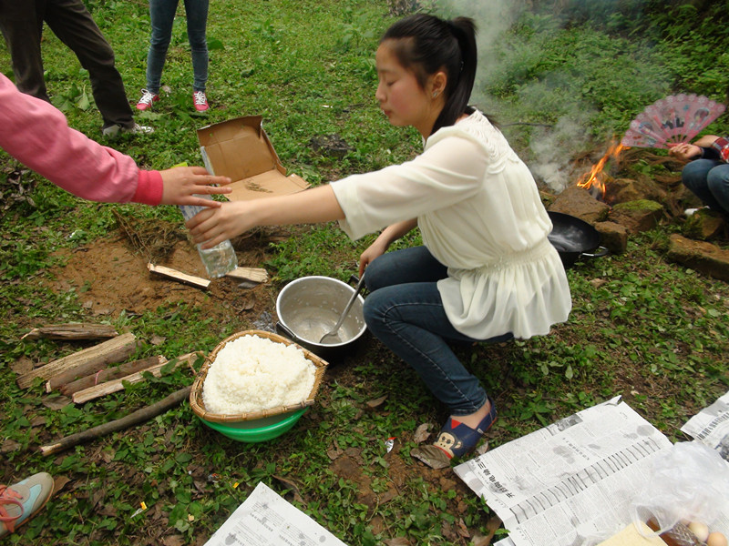 到达圆山子后,我们组的同学找好做饭的地盘,稍事休息便开始把锅碗瓢盆等炊餐用具拿出来摆放好。于是大家按着事先的分工各自干起活儿来,在老师的帮助下,我们挖好了灶,架起锅迫不及待地开始做饭了,我早早地把洗净的米倒进将要沸腾的锅里。过了一会儿,王老师过来了,他揭开锅盖有勺子在锅里搅了一下,问:"孩子们,你们是煮稀饭还是……"没等老师说完,大家异口同声的说:"干饭。"。老师看着哭笑不得说:"你们这样可不行的,锅里边米多水少,赶紧加水吧,要不然煮不熟的。",听了老师的话,我赶紧向锅里加水,才没有煮成夹生饭。