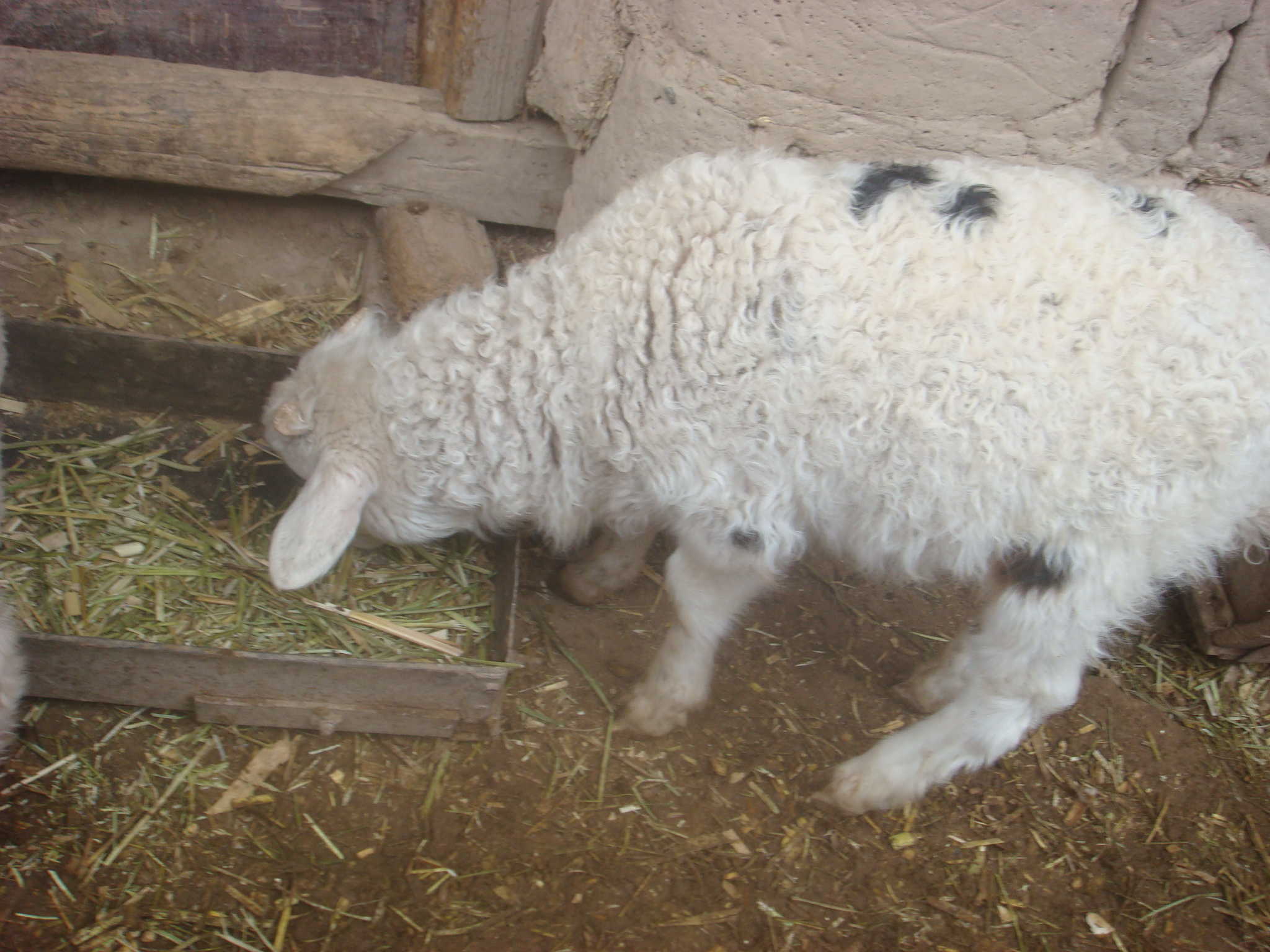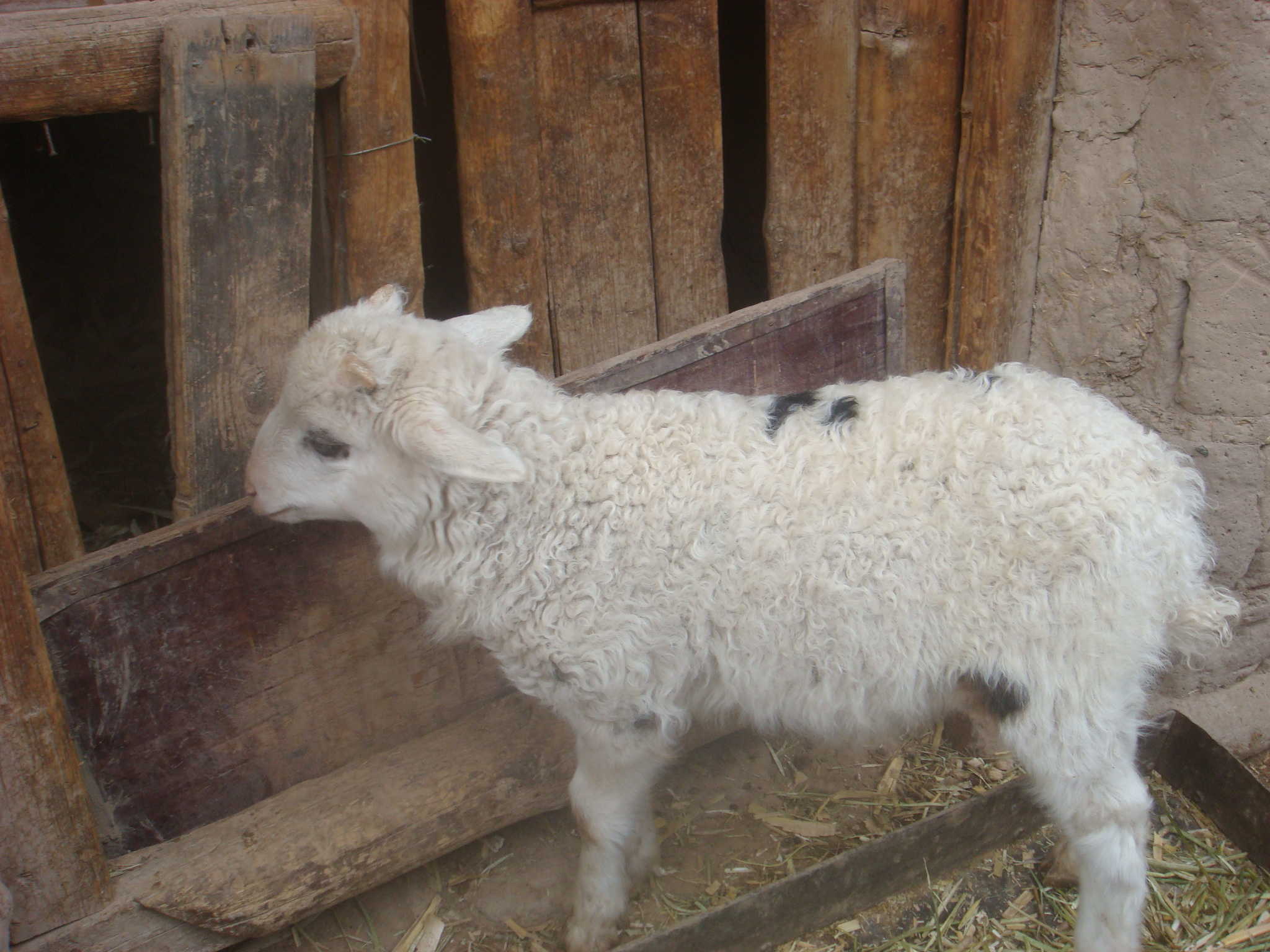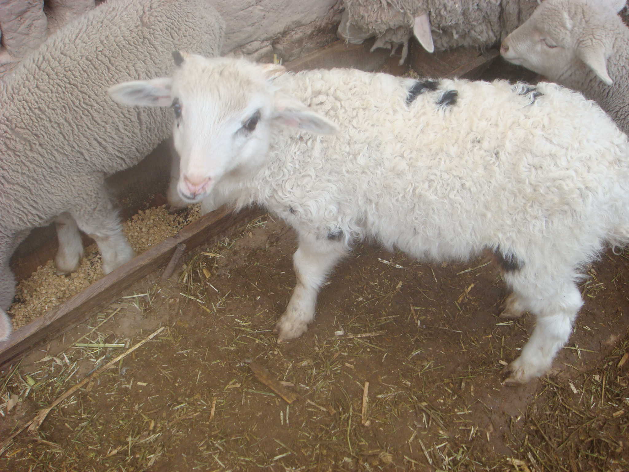 小羊羔白卷毛,身上夹着一点点黑色的毛,黑眼圈中那颗如葡萄的大眼睛和它平时的动作、行为可算得上最可爱的小羊羔了。