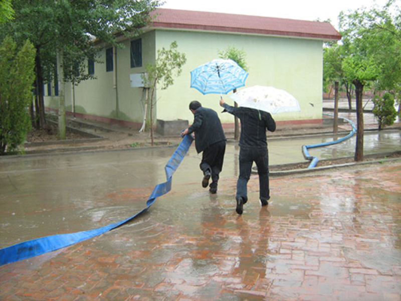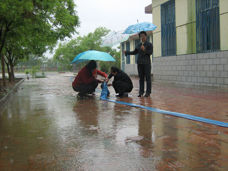 其他老师各有分工,有的男老师用泥将铁管固定住,女老师在旁边给打伞遮雨;有的老师抱着水管往花池里放;遇到水流太大,将两节水管冲开,有的老师就要冲过去将水管接上。雨可下得真大,老师们尽管打着伞,衣服还是湿透了。