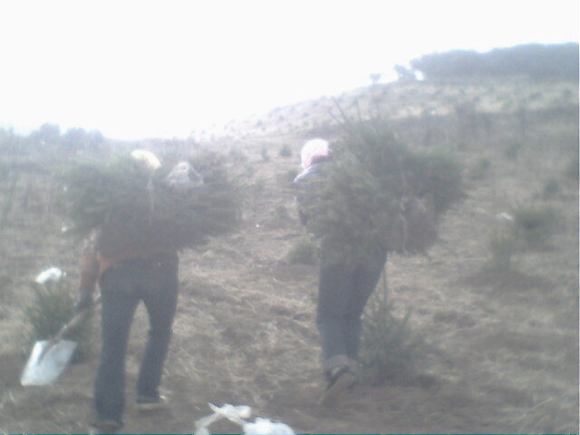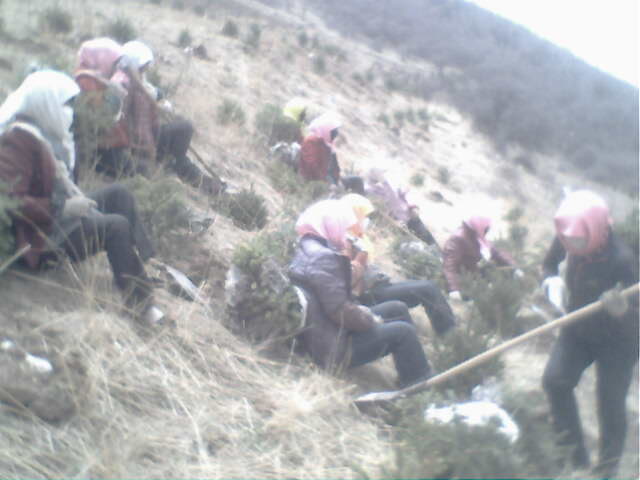 很幸运的是我们等在这的人数还不够所要人数,这也意味着我们可以不用担心"抢"不到机会。一路上大家七嘴八舌,有说有笑好像几年没见的老朋友说个不停。而我被车窗外沿途的风景吸引住了无心去听她们说些什么。我还没看够风景,车子就到了山脚下。老板要我们每人背一捆树苗,要是背的少栽完后还得要到山脚下去背,所以我所性被了一大捆为了少跑几趟。打架被这种种的树苗在山坡上艰难的前行着,累了就坐下来休息一会。