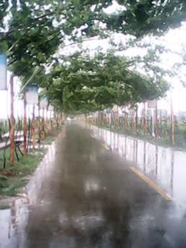我的家乡现在是一处旅游景点,所以,修建了一系列的公共设施,而这是为了夏天乘凉的葡萄隧道。用结实的支架支起来的,那些引进的新种葡萄树攀岩俯势的生长着,纵横交错着。现在雨中的隧道真漂亮。