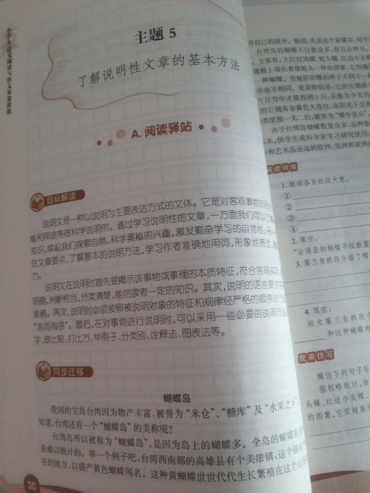 训练阅读的时候分为目标解读、同步迁移和拓展提升,目标解读是教我们如何分析短文,每一个目标解读都写的很详细,让人一目了然。同步迁移是针对这一解读给出的短文,有效的训练你对这一目标的理解程度。拓展提升有点难度,但也难不倒我,我认认真真的读,然后再做题,正确率还是很高的。