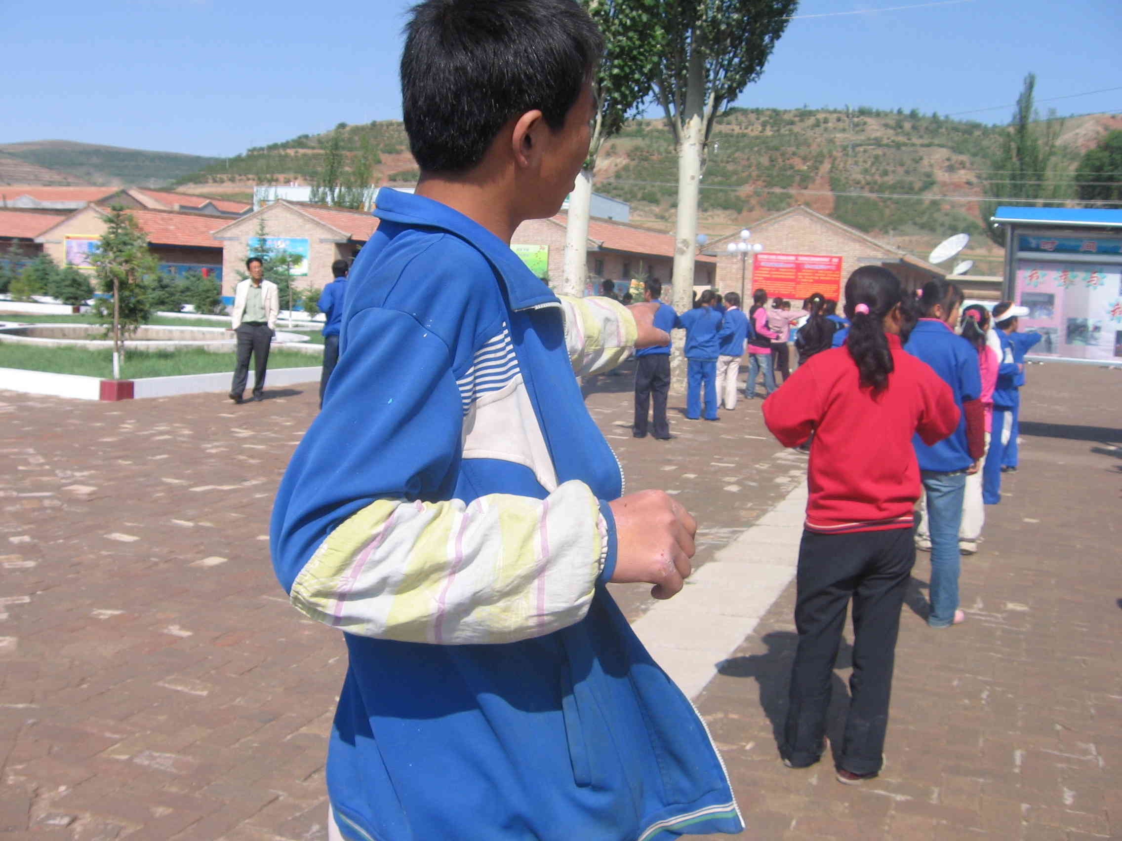 还有几位老师请亲自带着学生上了"战场",他们各带一个班做起了广播体操。同学们个个发挥着自己的本领。由老师带着做那是既整齐又好看。