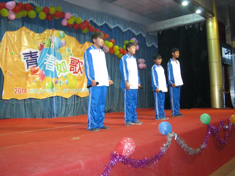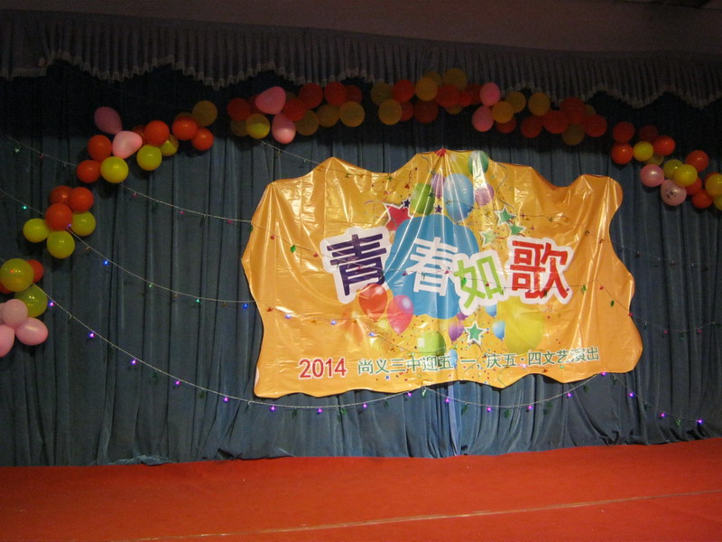 五一假期过后,我们返回学校。接着迎来了"五﹒四"青年节。同学们准备了一场五四晚会,在五月四日晚上上演了。序幕缓缓拉开,"青春如歌"四个大字映入大家的眼帘。