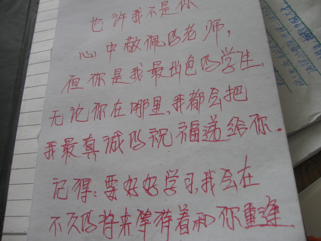 当我回到教室时,有位同学手里拿着两本笔记本向我走来,他说:"这是数学老师临走时让我转交给你的,"说完他转身而去,我带着沉重的心情打开了本的,几行鲜红的字进入我的眼帘;"也许我不是你心中最敬佩的老师,但你永远是我最出色的学生,无论你在哪儿,我都把我最真诚的祝福寄给你,记住要好好学习,我在不久的将来等待着和你重逢。"当我读完这句话时的那一瞬间,泪水早已湿了我的脸颊,心中有一股和往常不一样的温暖。
