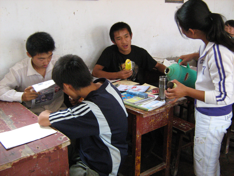每天中午放学后,最热闹的地方就是学校门口的小卖店。不能回家的同学便三五结伴的走向那里,买一些简单的面食品和水。由于学校条件有限,只能为他们提供开水房。午休时,同学们自我组织,轮流值日,每天有一名勤务生将开水提来,大家围坐在一起,边吃边聊,快活的度过他们每一天的在校中午。