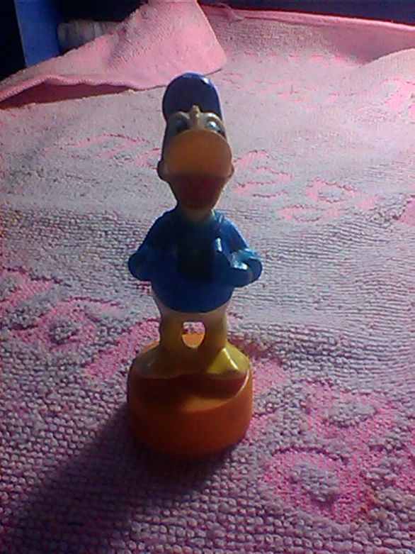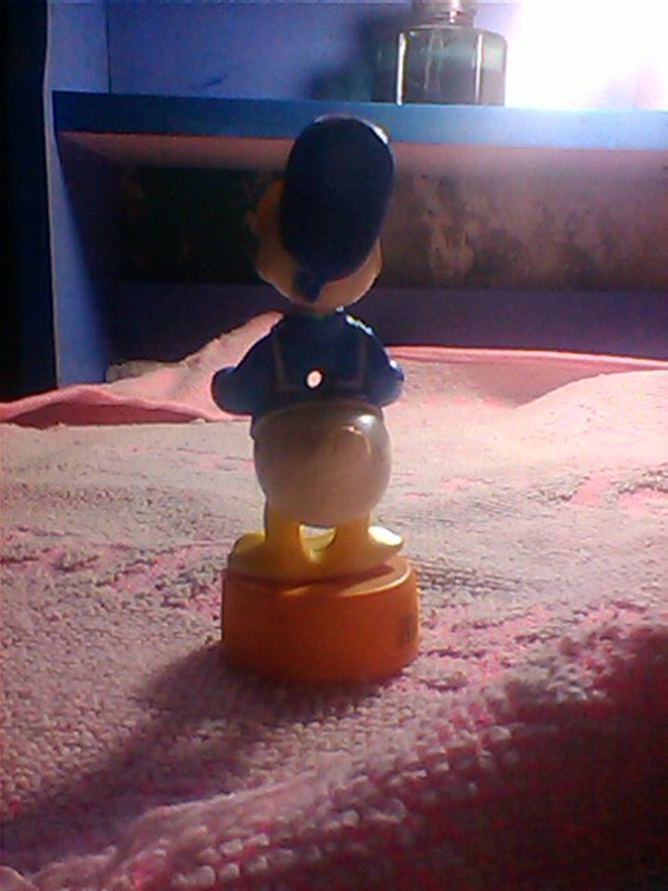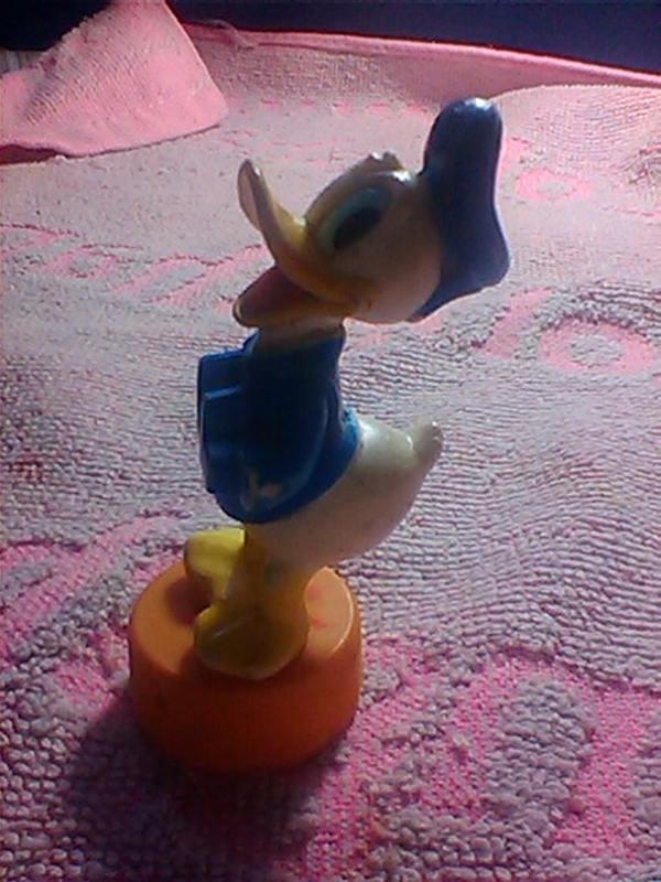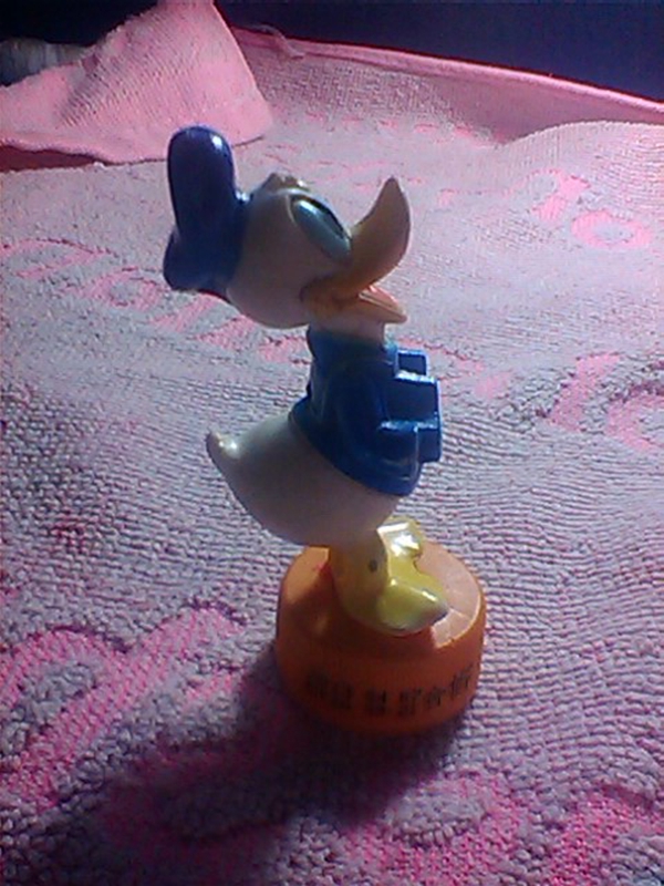 这个"唐老鸭"可神气了。它戴着一个蓝色的海军帽,冒尖高耸,但很像一面蓝色的旗帜,高高在上。它的身上穿着也是蓝色的海军军服。两只小手向前,据我回忆两手中抱着一架手风琴,却被年少无情的"我"拆了下来。
