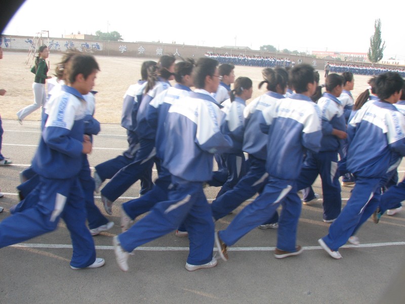 我们学校共26个班级,由于高三今年毕业了,现在就剩下高一、高二共19个班级,我们上早操都以班级为单位,有序的围绕着椭圆形的跑道跑步。好多老师们也每天和我们一起跑步,班主任们跟在各班的后面跑步,10分钟的跑步,接下来就是做早操,我们每个班做操的位置都是固定的,这样看起来很整齐。