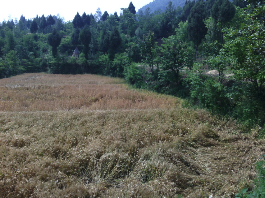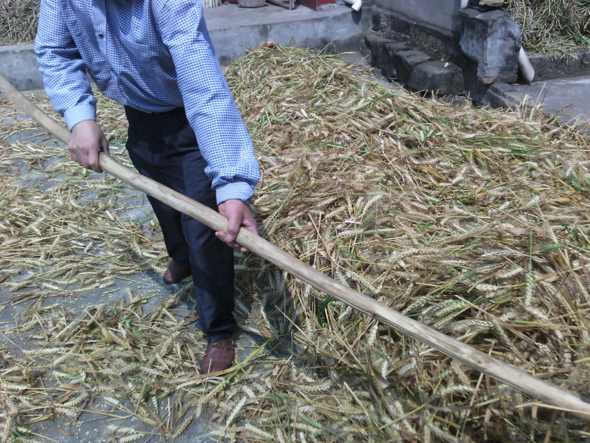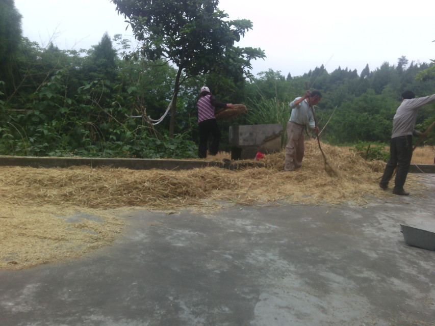 回到家里的第一眼就看大爹、大娘们手拿着割具在麦田里辛勤劳动着,我不由被这一画面所打动,今天的太阳可以说是十分的毒辣,我被曝露在外的皮肤被晒着有点显红。 走进家里我首先与来去匆匆的婆婆打了一声招呼,然后在爸爸的吩咐下开始了忙碌的工作。我的任务就是把大爹、大娘们割来的麦穗均匀着铺在元坝上,让它们充分均匀的吸取热量把麦穗晒干。