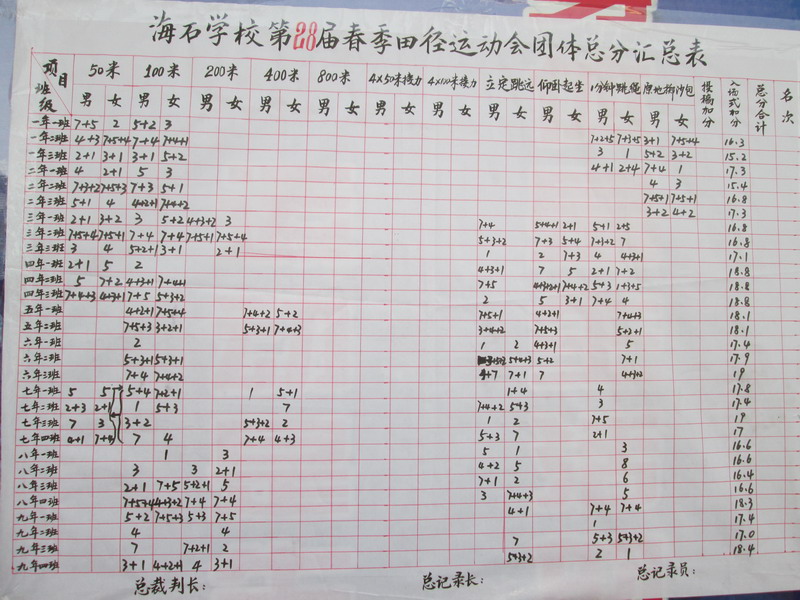 这次运动会我们班的成绩每天突飞猛进,尤其男生的项目都是全年级第一名,所以加的分数也特别的高,一下子把别的班级拉了一大截。