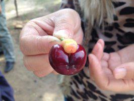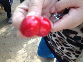 忽然,我又发现了一颗大樱桃上面躺着一颗小樱桃,我对妈妈说:"妈,这个樱桃是不是怀孕的樱桃?"周围的人笑起来,只有妈妈没笑,她仔细地观察着这个樱桃,说:"的确还真像,我们就叫它母怀子吧!来,给它来个特写!于是我就拿起妈妈的手机,拍下了这对可爱的母子樱桃。