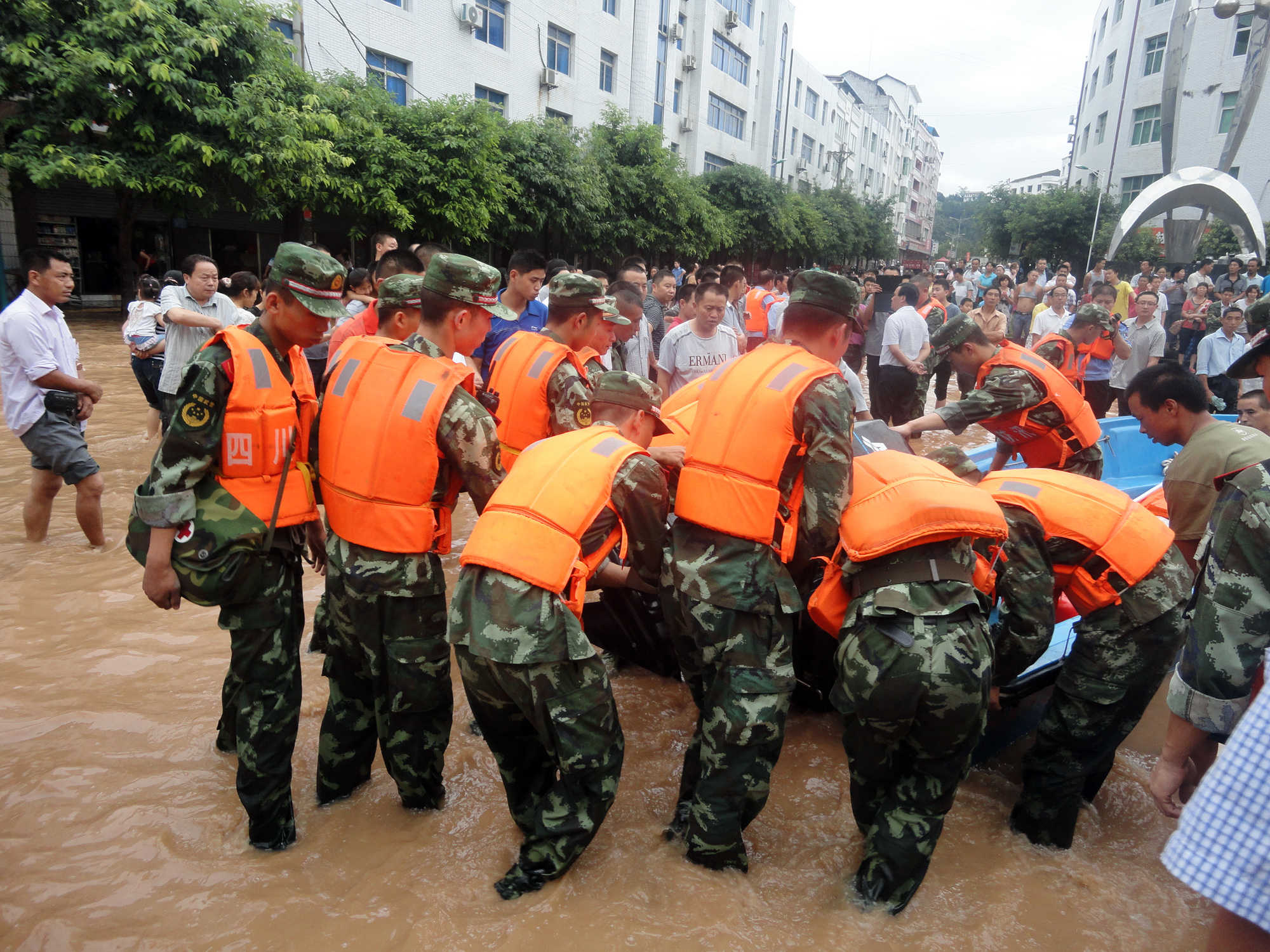 终于,领导们出现了,虽然个个神情凝重,但井然有序的指挥着人们抢险救灾。终于,救援官兵赶到了,背着年迈的老人,抱着年幼的孩子,将被困人员一个个运送到安全地点。他们的额头上,不知是雨水还是汗水,一滴滴地落在没了没腰过膝的河水中。等到一切救援工作结束后,他们脸上的露出了欣慰的笑容。 俗话说“远亲不如近邻”,邻里之间也互帮互助。谁家需要帮忙,一呼百应,都伸出了援助之手。同时来自四面八方的救援物资也源源不断的运到受灾地点,帮助人们共度难关。