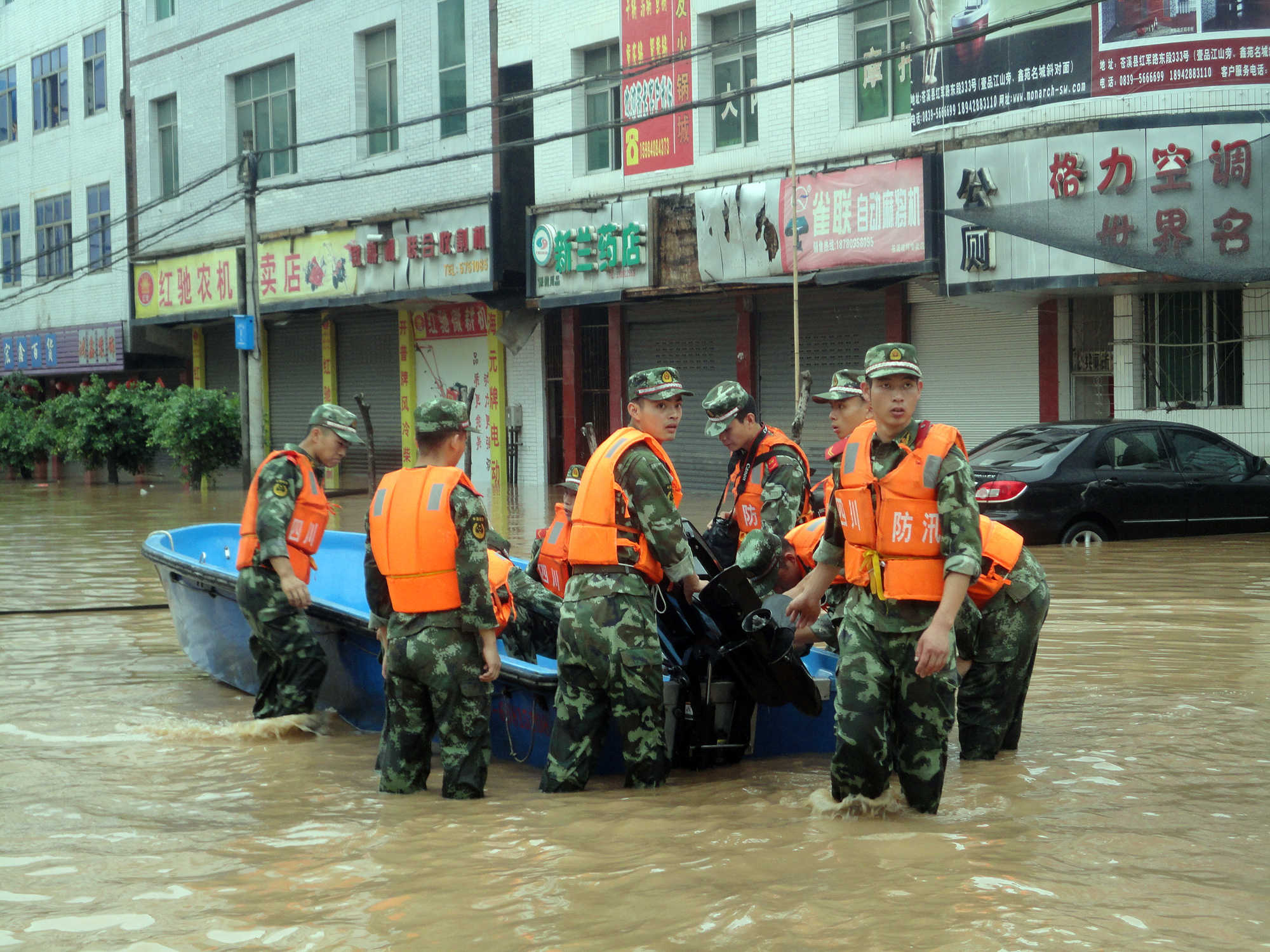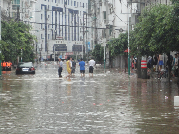 第二天一早,我睁开眼,看到的是一幅恐怖的画面:平日宽阔的街道,一夜间变成了浑浊的河道,两旁的楼房战战兢兢地立在水中,一楼的商铺早已浸没在水下。惊慌的人们只能眼睁睁地看着河水的肆无忌惮,却束手无策,任其冲击着房屋,冲击着他们辛辛苦苦积累的财富,冲击着他们渐渐绝望的心。