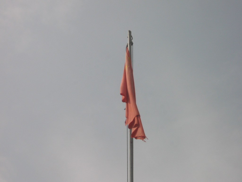 在教学楼前面有一面五星红旗迎风招展。