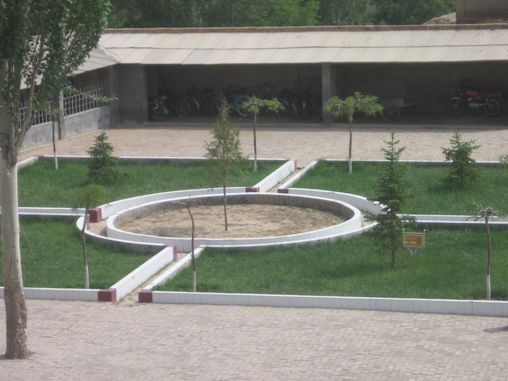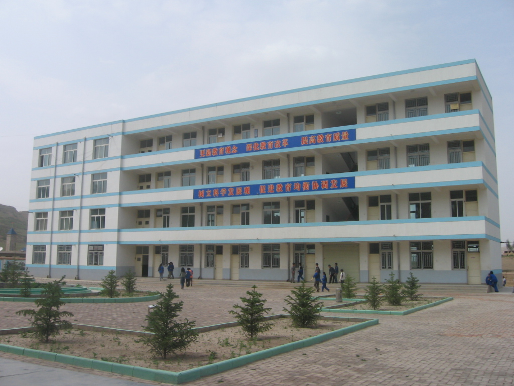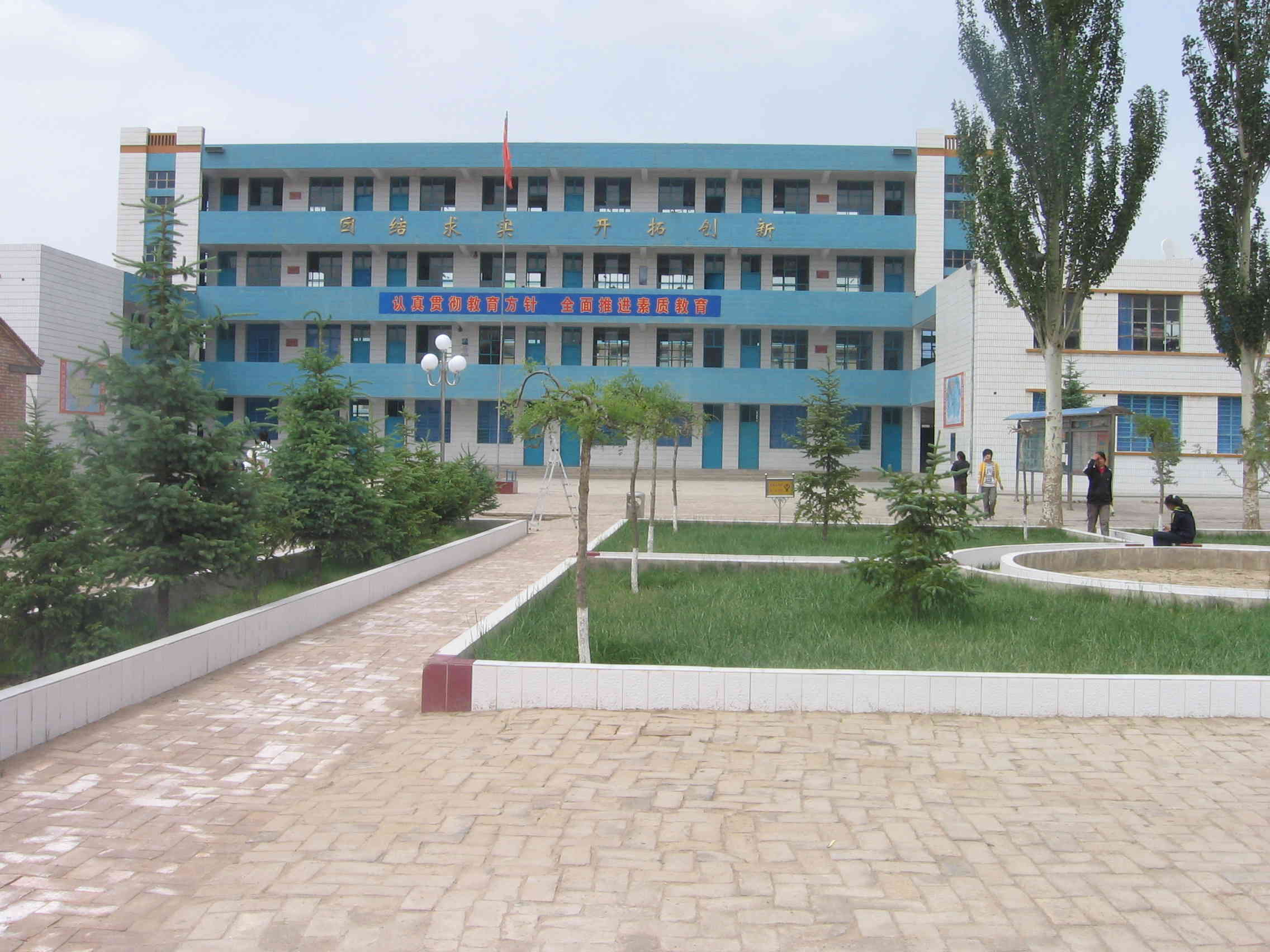高大的蓝色教学楼立在校园的正中,走上一台阶就可以看到楼梯旁边写"请写规范字,请讲普通话"的牌子,教学楼的两边是宿舍。
