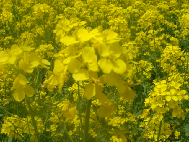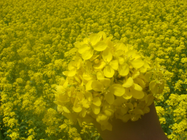 走近田边 ,轻轻的捡起一片接近于枯萎的油菜花瓣,发现上边似乎写着:"落红不是无情物,化作春泥更护花。"我由衷的感慨着灿烂的金黄会逐渐脱变成那绿油油的,盛满菜籽的小匣子,到了五月份时候,这些油菜变成了饱满的油菜籽,经过加工厂,成为了喷香的菜籽油,它,见证者农民们"面朝黄土背朝天的艰辛。"望着眼前漫野的金黄,欲滴欲诉般的动人,你有什么理由不去歌唱他们?