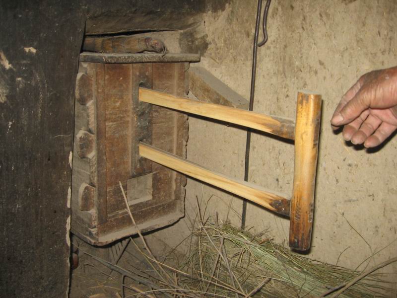 它还需要俩块长长的木棍,俩根平行的木棍穿过前面的挡风板,连结里面的鸡毛木板,一根光滑的木质手板,垂直于俩根木棍并和木棍相连手柄是放在`手板往里。推的时侯,前面的进风门就会自动张开,空气顺势进入里面,在往外拉的时候,前面的风门会自动关闭,后面的风门会自动打开。这样风匣工作时,前后俩个风门有节奏的关闭和张开,堵气或吸气,并且发出有节拍的响声。左侧的通风口将风送入旁边的锅灶下。