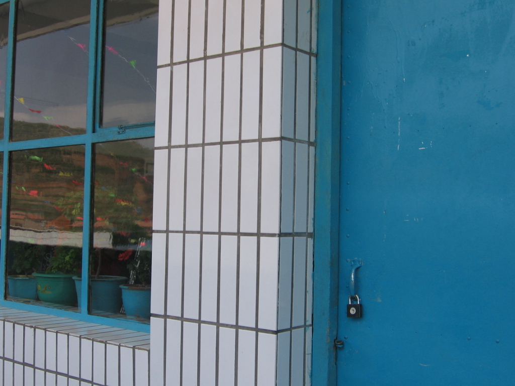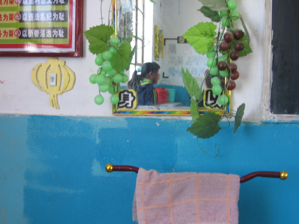 前面黑板的左面是我们洗漱打扮的地方,墙上装有一块镜子上面贴着"以身鉴证"的标语,下面放有洗漱的套具。这样我们我们每天都不用脏手吃东西了。