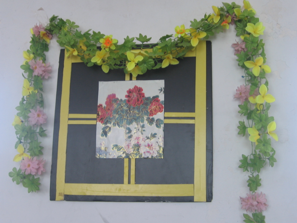 更有趣的是,我们教室的空墙上都有一幅画,它是我们自己创作的,上面贴有买的花边,花边包围着纸画。