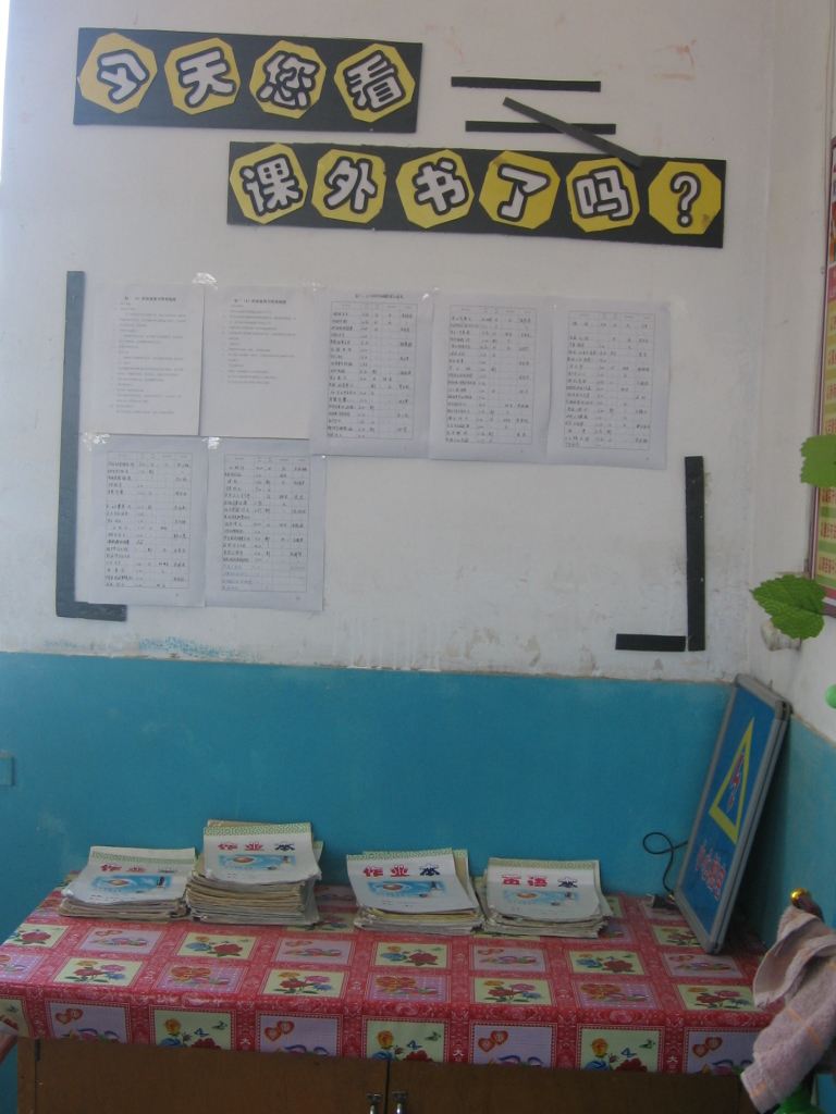 进入教室,映入眼帘的便是我们课外学习的地方。墙上面标着"今天你看课外书了吗?"九个大字。以及借书制度和图书名称。下面是装图书的小柜子,也是我们放作业本的地方。自创图书室的建立,是我们学到很多知识。