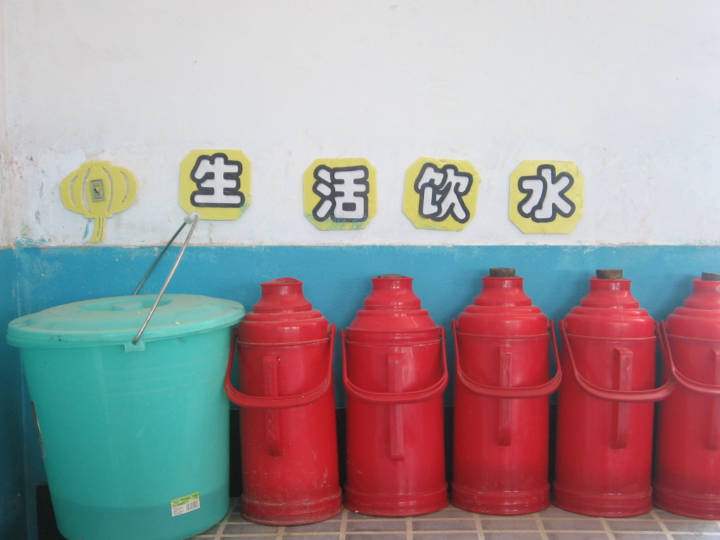 学习园地的右侧是我们生活饮水的地方,我们用勤工俭学的方法争来一些钱,给我们买来水壶。老师还吩咐我们一人一个水杯,没上灶的同学还可以泡方便面吃。