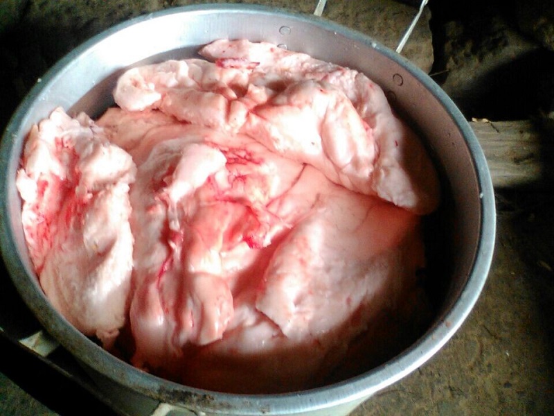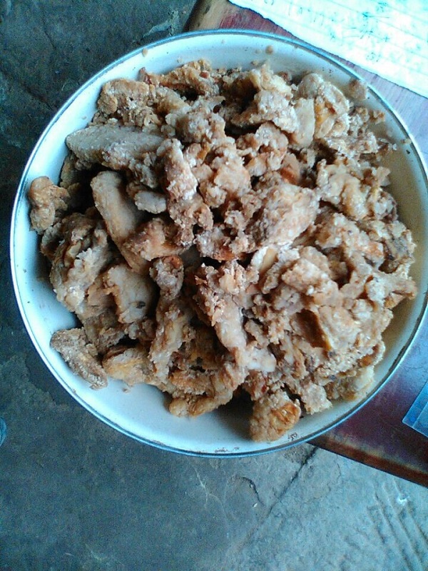 第四步;一个小时后,锅中的油已经熬的金黄,板油块也熬成了二平方厘米大。这时,油就熬好了。然后,再用干净的盆子将熬好的油一勺一勺的舀出来,盆子一定得擦干净,不能有水,不然油也回溅出来。最后,将剩在锅中的东西,我们这儿管它们叫"油渣",这个可以用来喂猪,猪吃了长得壮。如果中午就把油舀在盆中,放在通风处,傍晚时,盆中的油就变成了白花花的猪油了,这样储存一年都没问题。