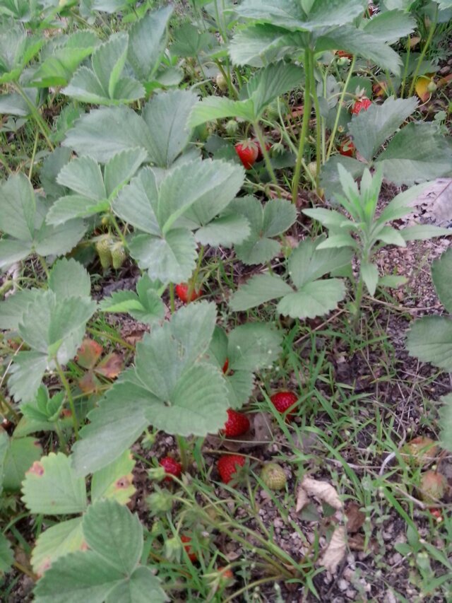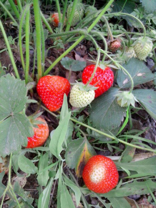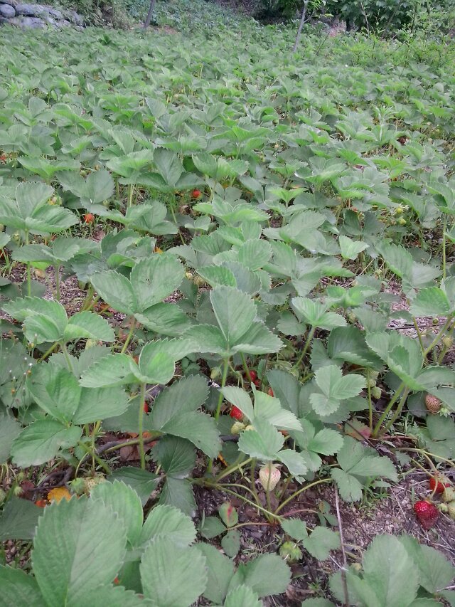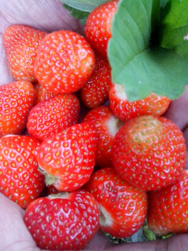 今天是星期六,做完功课,我和妈妈早早的来到我家后院的空地里。哇!满地红红的草莓,香气逼人,口感也很好。草莓的外形像鸡心,但是比鸡心大得多。它的茎杆很细,支撑不住草莓,所以草莓总是躺在地上,太阳光照的那一面红得发紫,而贴在地上的那一面百里透红。