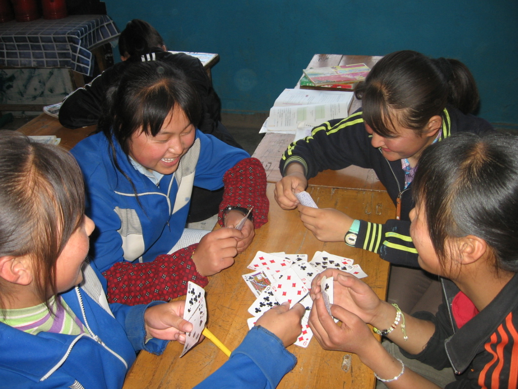 忽然我看见了一副牌,我说:"我们玩牌来吧,谁输了谁就给东西,怎么样?"他们没有多想,一口就答应了,我们玩的是三打一,结果 我输了,所以我就给他们唱了一首歌。
