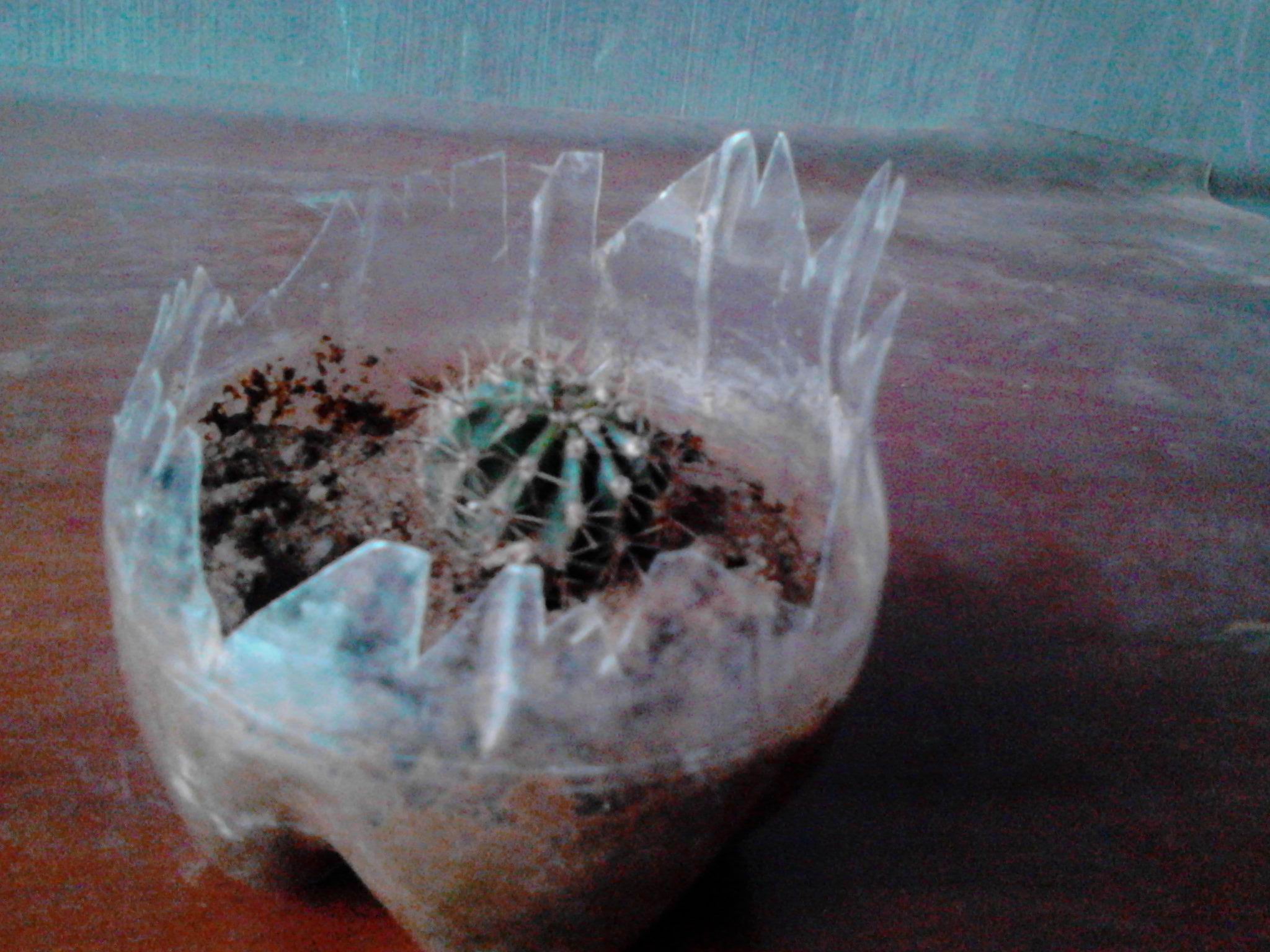 平日里,妈妈就爱养些花花草草,比如客厅茶几上,妈妈就摆放了一盆仙人球,绿绿油油的可爱极了!他的"家"也很漂亮,是妈妈用喝过的饮料瓶从中间剪开,再见了一些参差不齐的三角形,整体看来也蛮精致的