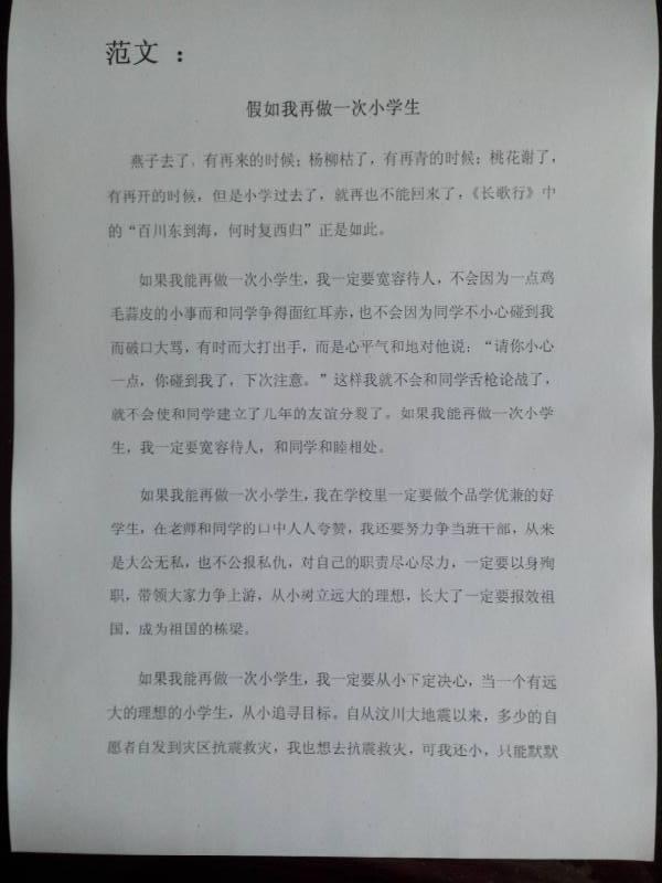 如今当我面对《假如让我再做一次小学生》这个题目时,我首先想到的是我的作文水平。现在,当我看着字词句篇和作文书上一篇篇的写作范文时,便忍不住埋怨自己:你看看作文书上的作者们是怎样写作文的,同样的学习经历,同样走过的小学历程怎么就相差那么多!想想自己的作文本上那不通顺的语句和挖空脑袋也想不出的名人警句,这些还不是因为这六年的时光没有掌握足够的知识吗?我便又开始幻想:假如我再做一次小学生,我一定从一年级的写话开始,认真斟酌每一个词语,把所有的句子都写通顺;一有空就多看看作文书,从小培养写作的能力。在写作文前一定要先列一个提纲,让我的作文层次分明。另外我要留心观察生活,学会用具体事例来说明道理;平时多看课外书;看书的时候也要随手勾画和抄录有趣的句子,并把它们都应用在自己的习作当中。还要学习和掌握他们的写作方法,应用各种题材让自己的作文变得生动、形象。这样我就不会又看着作文书上的范文叹气了。
