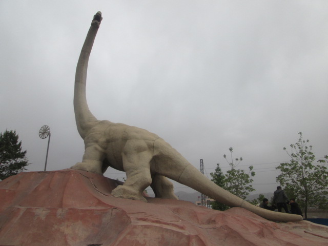 在广场中央有家乡闻名华夏的标志建筑马门溪龙仿制雕像,马门溪龙,拉丁文学名Mamenchisauras。体长16-30米,体重20-30吨。食性:植物食。生存时代:晚侏罗纪时代。分布于:中国蒙古。分类:蜥臀目,蜥脚类,蜥脚型类,原始蜥脚型类,盘足龙科,释义:马门溪龙意为在海石湾马家户沟发现。所以起名叫马门溪龙。