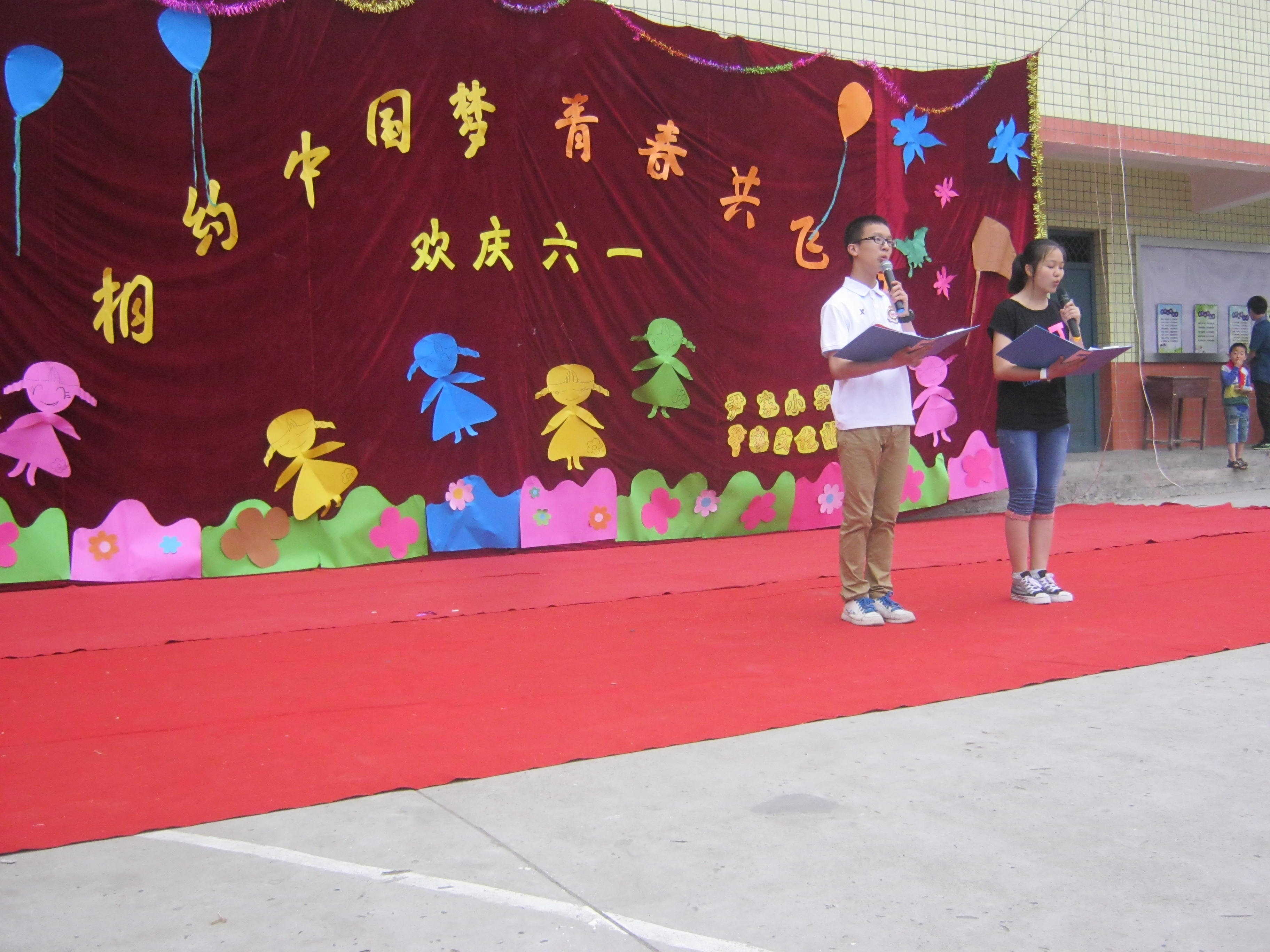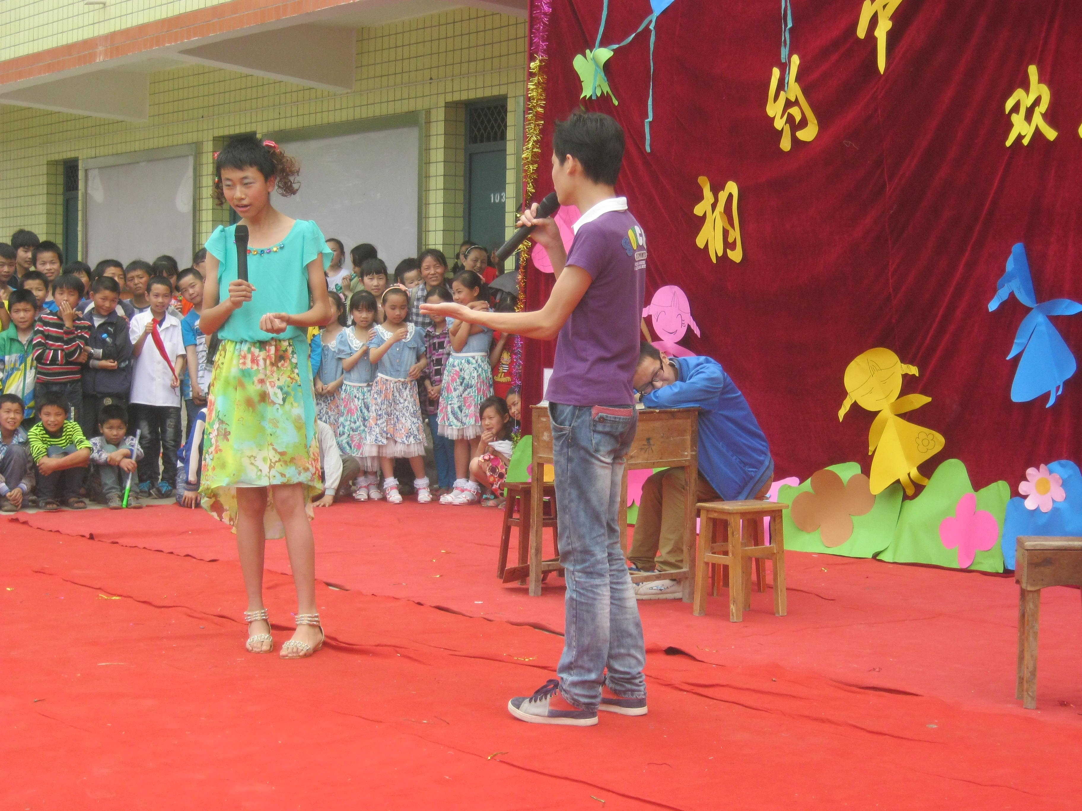 我不像他们那样忙碌,因为我什么节目也没参加,所以我很爽的睡到了自然醒,然后才慢悠悠的去吃饭。当吃完饭时,这时的操场已经聚集了不少的家长和学生以及村校的小弟弟小妹妹们。因为我们学校没有舞台,所以只能在操场上搭建一个临时舞台。我看见舞台还没搭好,于是我便毛遂自荐的去帮起忙来。舞台搭好了,我自然也很高兴了,这时候人也来得差不多了,节目也正式开始了,先是由我们学校的体育老师刘老师整理队伍,再是苟校长讲话,接着那精彩的节目开始了。