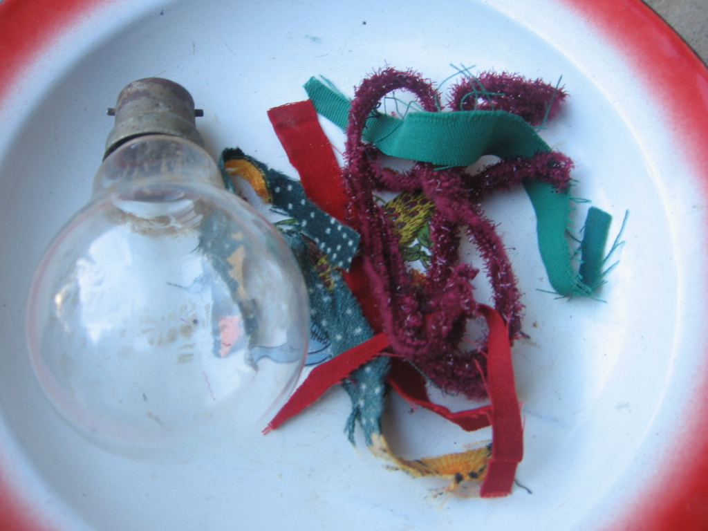 这个时候,布,是无法进入灯泡的,所以我们要将带丝的玻璃取掉,不管用什么,但一经要灯泡完美无缺,然后将各色的布塞进去,一种颜色的布占一个位置,直到布用完。